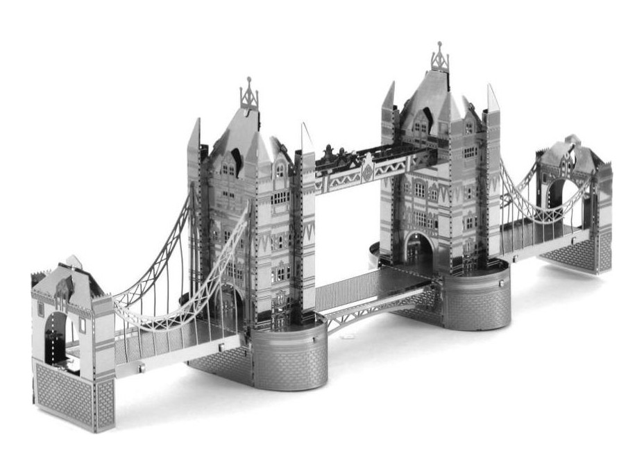 Vzrušující výzva, zážitek při skládání a oslnivý výsledek – to jsou modely METAL EARTH! Stavba 3D puzzle METAL EARTH vyžaduje trpělivost a šikovné ruce. Výsledek práce však plně vyváží vynaložené úsilí! Miniaturní repliky jsou obzvláště působivou a poutavou dekorací nejen doma, ale také v kanceláři či ve škole. Z čtvercových plátků oceli (11 x 11 cm) s částmi světových monumentů, slavných dopravních prostředků, hudebních nástrojů či zvířat Vám pod rukama vyrostou detailně propracované, fascinující modely. Autentický vzhled 3D puzzle METAL EARTH je dosažen díky detailnímu laserovému gravírování . Balení obsahuje 2 ocelové plátky s dílky a návod na složení. Nářadí není součástí balení. PRACOVNÍ POSTUP: Jednotlivé díly vyjměte z kovových plátků, v případě potřeby použijte malé štípací nůžky (nejsou součástí). Dílky se spojují k sobě pomocí zámků tvořených úchytem (zobáčkem) a otvorem. Zobáček ohněte pomocí malých tenkých kleští (nejsou součástí) a postupně spojte všechny zámky až vznikne velmi realistický mistrovský kousek! Doporučený věk: od 14 let. Tower Bridge je zvedací most v Londýně nad řekou Temží. Vedle něj stojí pevnost Tower, podle níž se jmenuje. Stavba mostu započala roku 1886 a trvala 8 let. Na práci se podílelo 5 hlavních dodavatelů a 432 dělníků. Na podporu stability mostu byly na říční dno položeny dva masivní pilíře; každý obsahoval více než 70 000 tun betonu. Kostra věží a mostu samotného byla vybudována z více než 11 000 tun oceli a jako obložení mostu na ochranu ocelové kostry i pro vylepšení vzhledu byla použita cornwallská žula a portlandský vápenec. Více na Wikipedii Rozměr složeného puzzle cca 14 x 5,7 x 2 cmVlastnosti