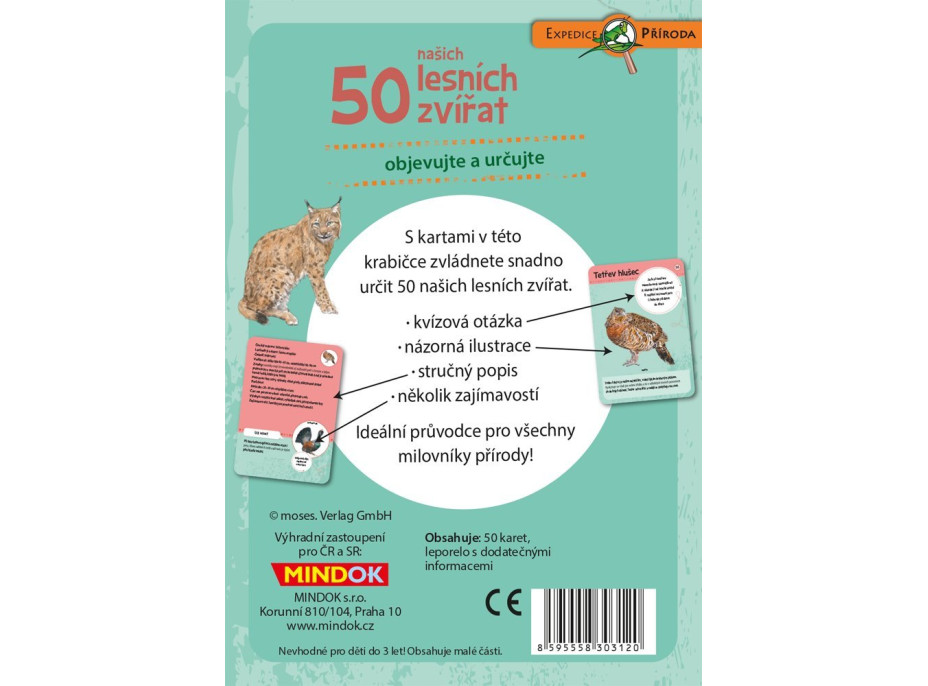 Díky kartám v této krabičce zvládnete hravě určit 50 zvířat, žijících ve volné přírodě. Na kartách najdete kvízovou otázku, názornou ilustraci, stručný popis a také několik zajímavostí. Ideální průvodce pro všechny milovníky přírody! Balení obsahuje: 50 karet, leporelo s dodatečnými informacemi.Vlastnosti