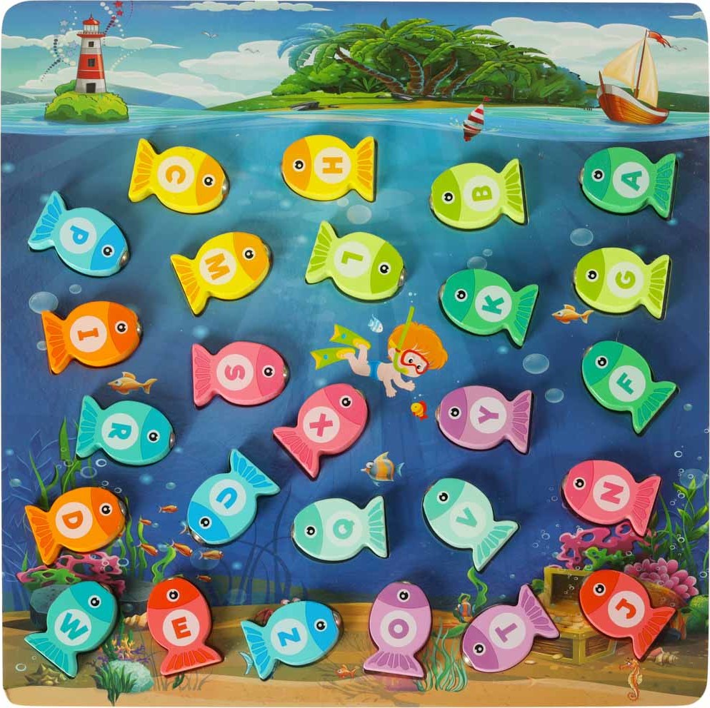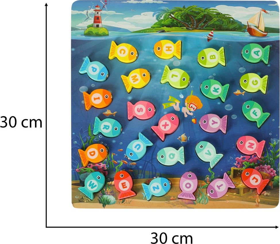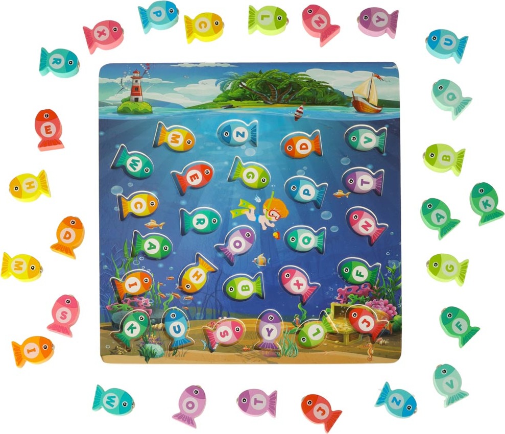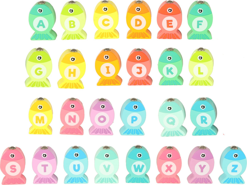 - VKLÁDAČKA/VZDĚLÁVACÍ SKLÁDAČKA- shodné tvary - Každá ryba má na sobě jedno z písmen abecedy. Přiřaďte každou rybu ke správnému otvoru.