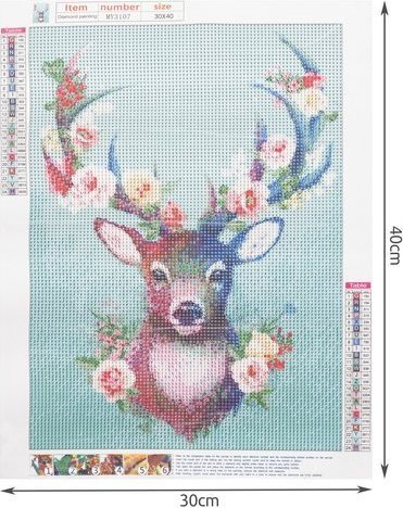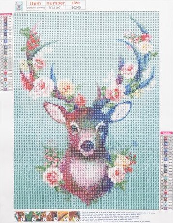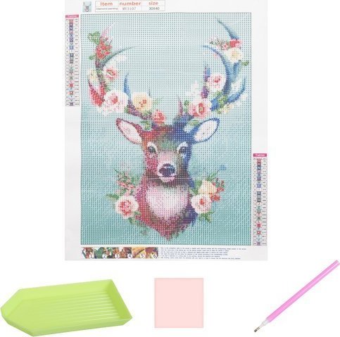 Balení obsahuje: předlohu, barevné diamanty, aplikátor, suché lepidlo, nádobku