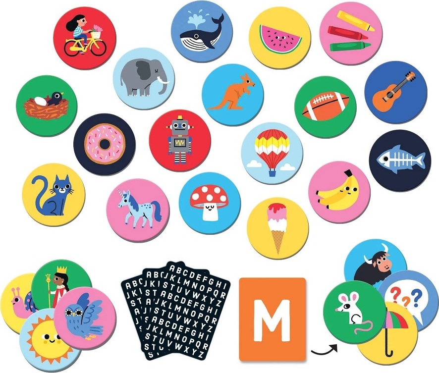 Představujeme Vám vzdělávací a zábavnou hru pro dva a více hráčů. Hra obsahuje 60 žetonu s obrázky a 26 karet s písmenky. Cílem hry je, co nejdříve najít žeton s obrázkem, který má počáteční písmeno na kartě. Hráč s nejvíce žetony je vítěz. Vše je zabaleno v cestovní tašce se stahovací šňůrkou.