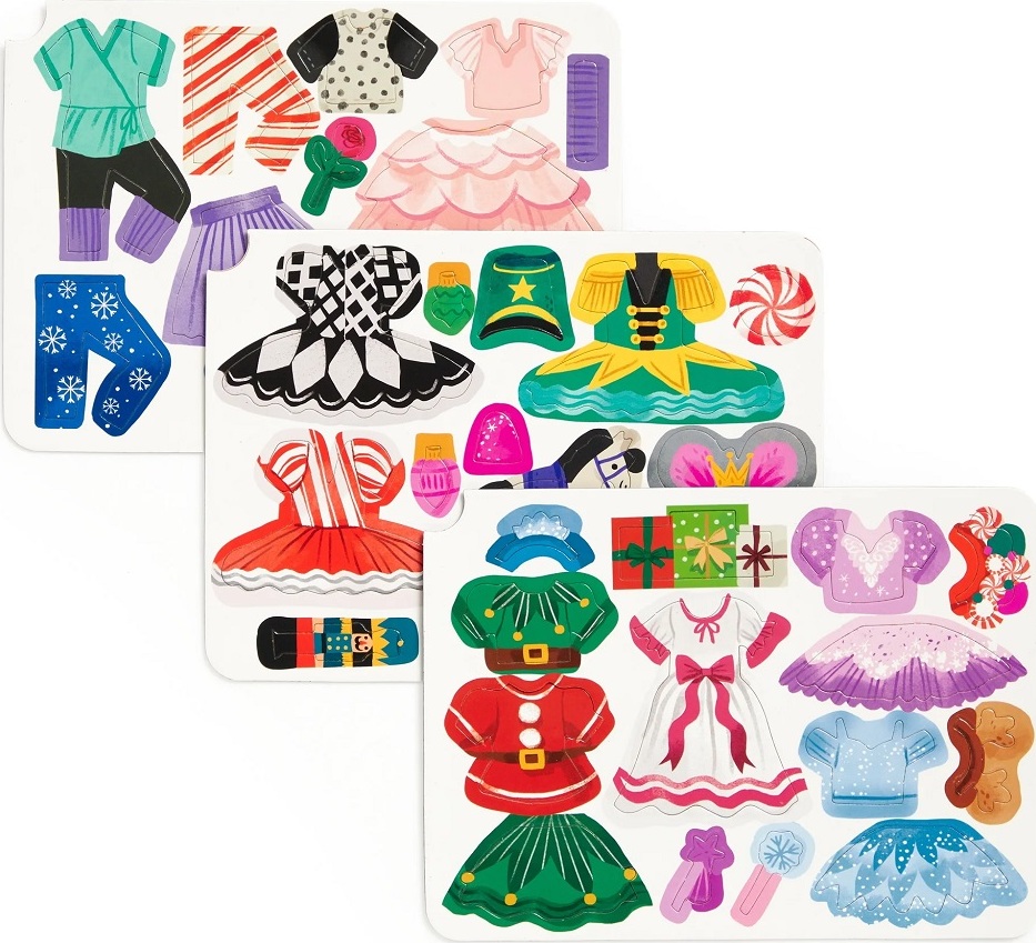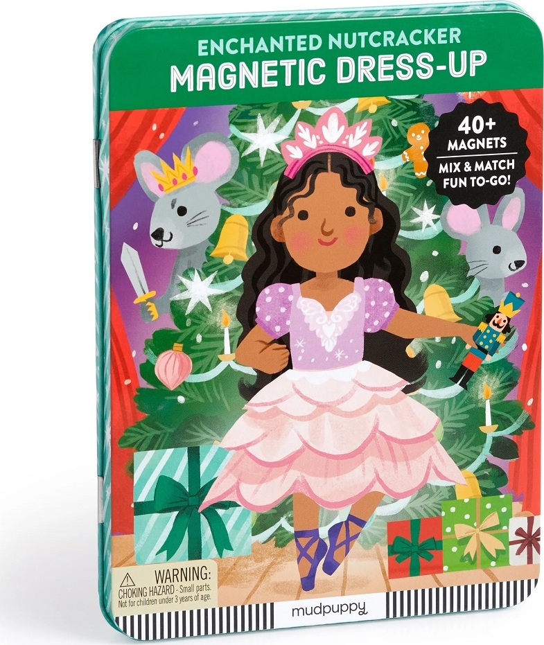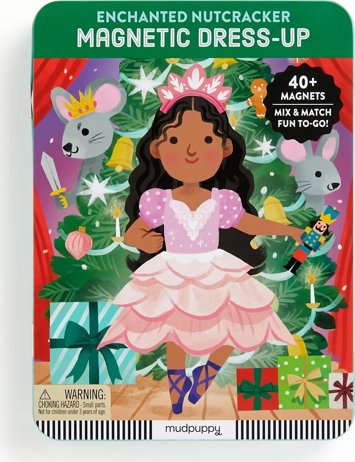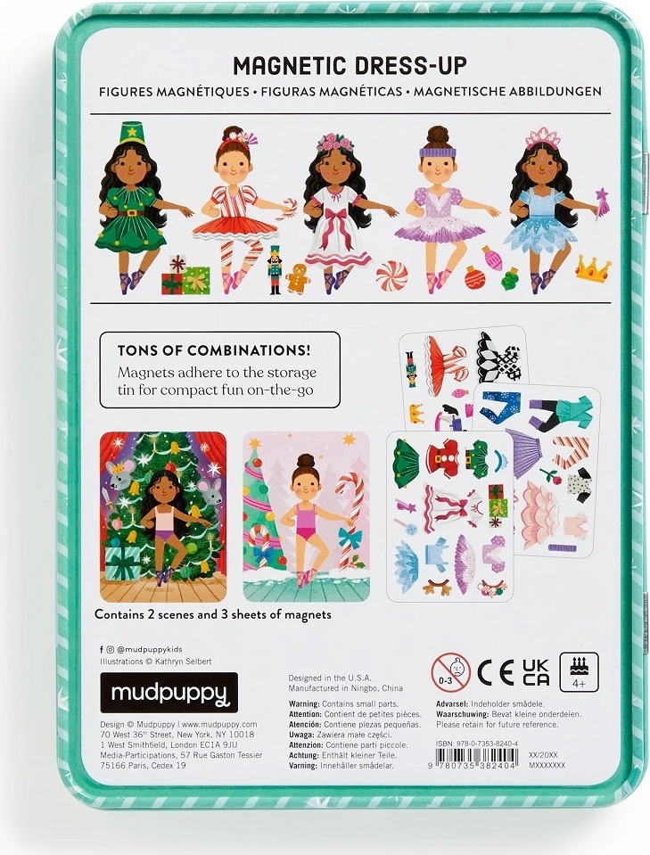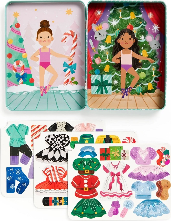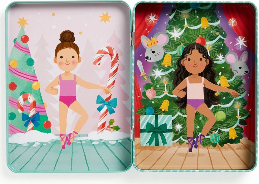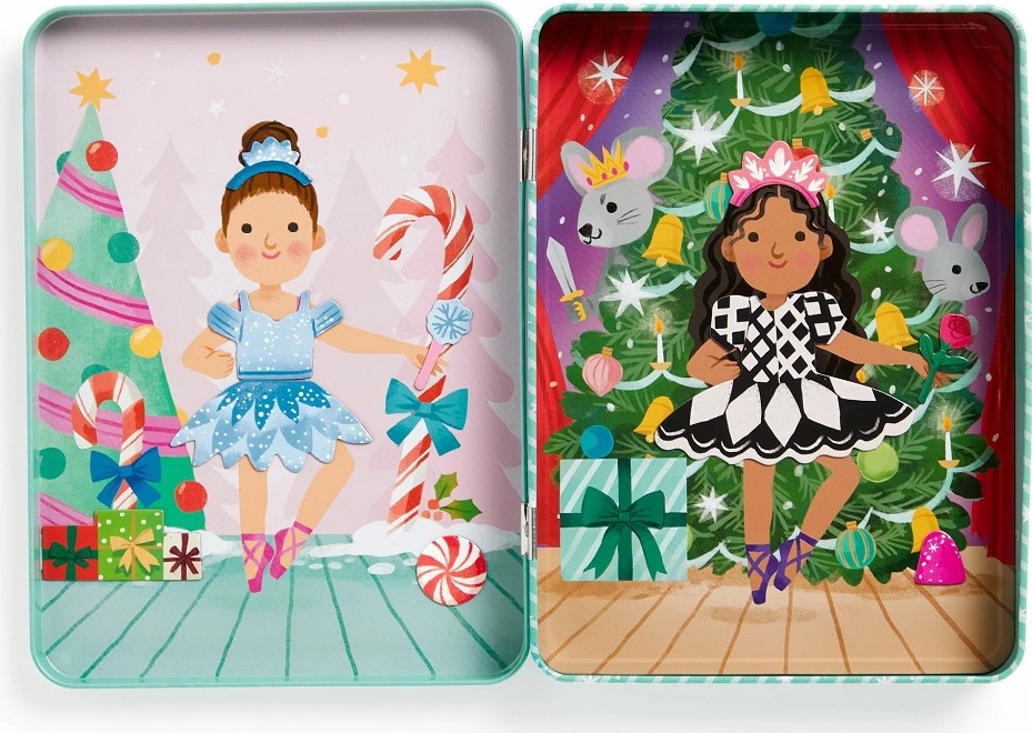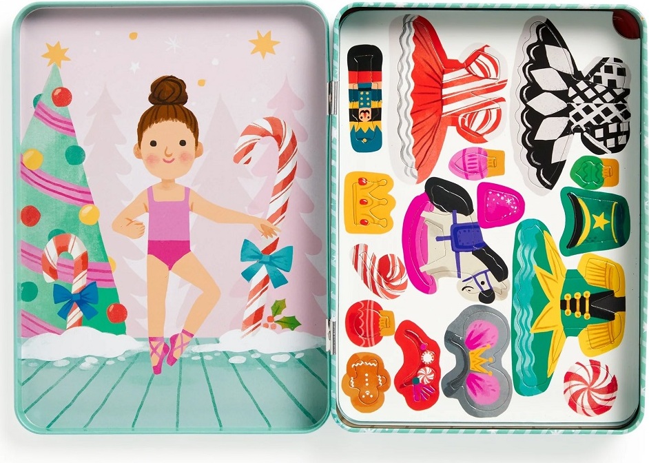 Navrhni si svou vlastní sváteční baletku! Tato kreativní magnetická sada obsahuje 3 archy magnetek, díky kterým si děti mohou navrhnout svou vlastní baletku – obléknout ji do svátečního kostýmu, přidat doplňky a vytvářet znovu a znovu nové kombinace. Hra obsahuje 2 ilustrované scény na pozadí, v každé části je jedna baletka, která čeká na své oblečení. Skvělá hra na doma i na cesty – všechny magnetky drží přímo na vnitřní straně kovové krabičky, takže je vše bezpečně pohromadě.