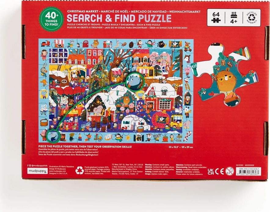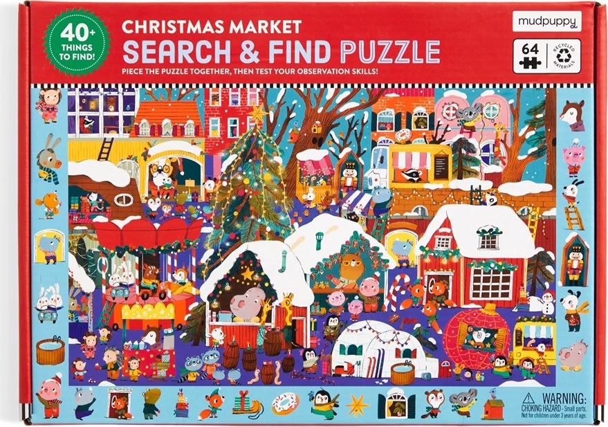 Děti si zamilují krásné obrázky vánočních obchůdků a výzdoby roztomilého zvířecího městečka, které se připravuje na svátky! Nejprve si děti mohou poskládat 64dílnou skládačku s pestrou sbírkou vánoční atmosféry. Skládání puzzle je teprve začátek zábavy! Až bude hotové, mohou děti zapojit své bystré oči a hledat více než 40 vánočních zvířátek a předmětů, které jsou namalované kolem obrázku a všechny se dají najít i přímo v puzzle! Dokážete je všechny objevit?