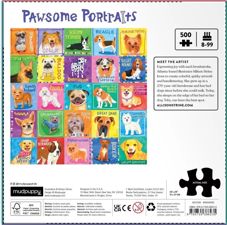 Puzzle Psí portréty od značky Mudpuppy obsahují 500 dílků a představují pestrou směs různých psích plemen s jejich oficiálními názvy. Puzzle má ideální obtížnost, aby si ho mohla užít celá rodina. V balení najdete plakát s celým obrázkem pro snadnější skládání. Perfektní dárek pro každého malého milovníka pejsků! Puzzle je vyrobeno z pevného kartonu, má krásně syté barvy, které zaujmou dětské oči, a podporuje hraní bez obrazovek. Pomáhá rozvíjet logické myšlení, prostorovou představivost i koordinaci ruky a oka. 500 pevných dílků má tzv. "ribbon cut" tvar pro snadné spojování.
