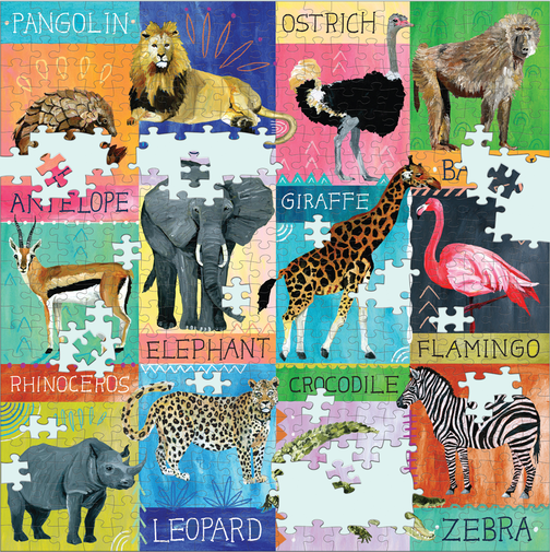 500dílné rodinné puzzle koláže Safari obsahuje 12 zvířat ze safari včetně lva, zebry a plameňáka. Puzzle je baleno v pevných krabicích s matným povrchem. Umělkyně Jessica Swift.