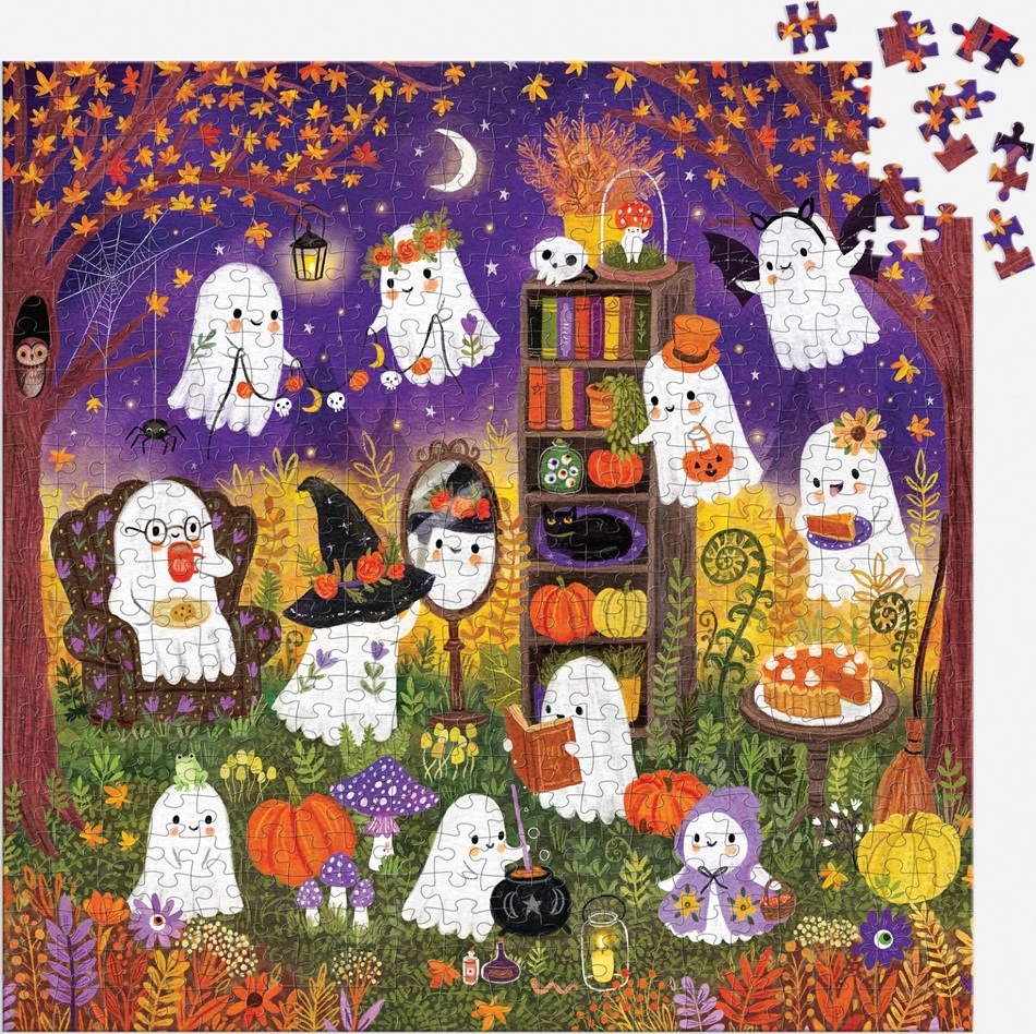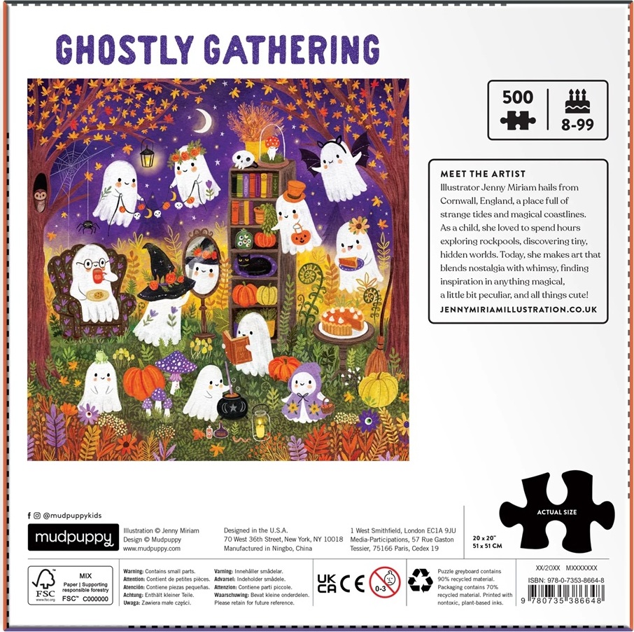 Užijte si tajemnou zábavu! Toto strašidelné puzzle s partou roztomilých přátelských duchů bude ideální zábavou pro rodinné večery. Skládejte dílky k sobě tak, aby perfektně zapadly a odhalte tak trochu děsivou scénu! Puzzle je vyrobeno za použití významného podílu recyklovaného papíru a nabízí špičkový potisk nezávadnými barvami. Je opatřeno matnou povrchovou úpravou, která zajišťuje věrné podání detailů i barev. Zadní strana puzzle je potažena hladkým, na dotek příjemným povrchem, díky němuž se na něm netvoří prach. Autorka obrázku Jenny Miriam vytváří ilustrace, které spojují nostalgii, hravost a jemnou magii, s lehce podivínským půvabem a velkou dávkou roztomilosti. Její styl vdechuje produktům jedinečnou atmosféru, kterou si zamilují děti i dospělí. 500dílné puzzle je obtížné jen tak, aby si ho mohli užít všichni členové rodiny společně. Připravte se na skládání, které je spíš roztomilé, než strašidelné!