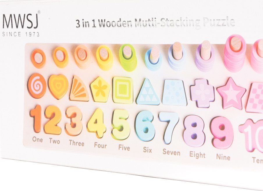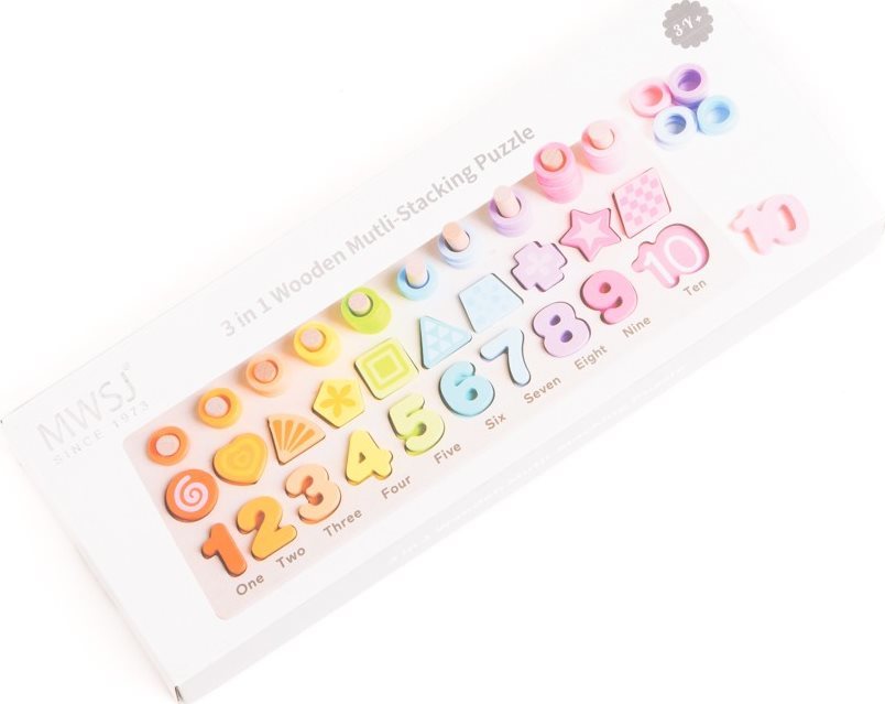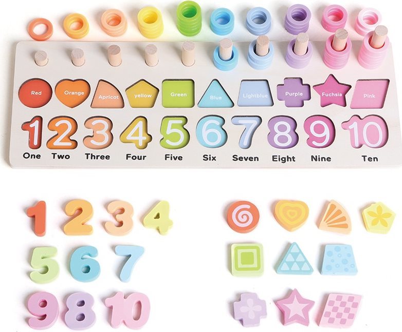 Dřevěná multifunkční vkládačka nabízí velké množství aktivit. Vkládačka je ideálním pomocníkem pro první seznamování se s čísly a tvary. Na téměř 1 cm silné podkladové desce jsou vyfrézované jednotlivé otvory, kam patří více než 80 dílků.