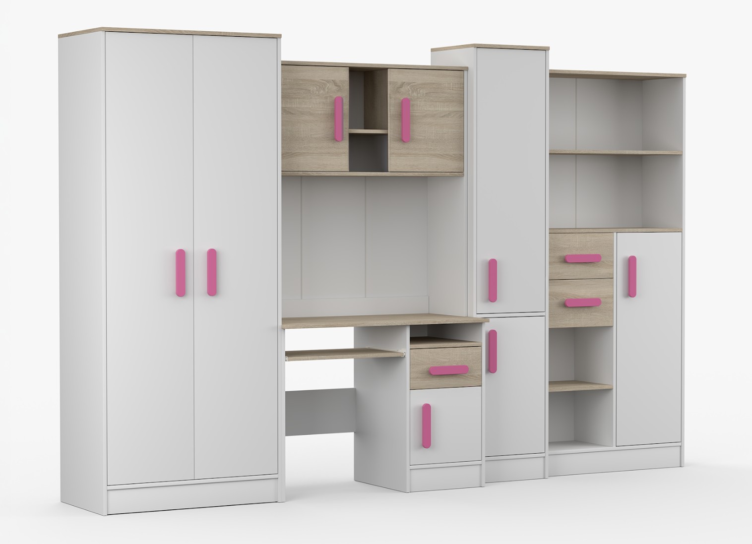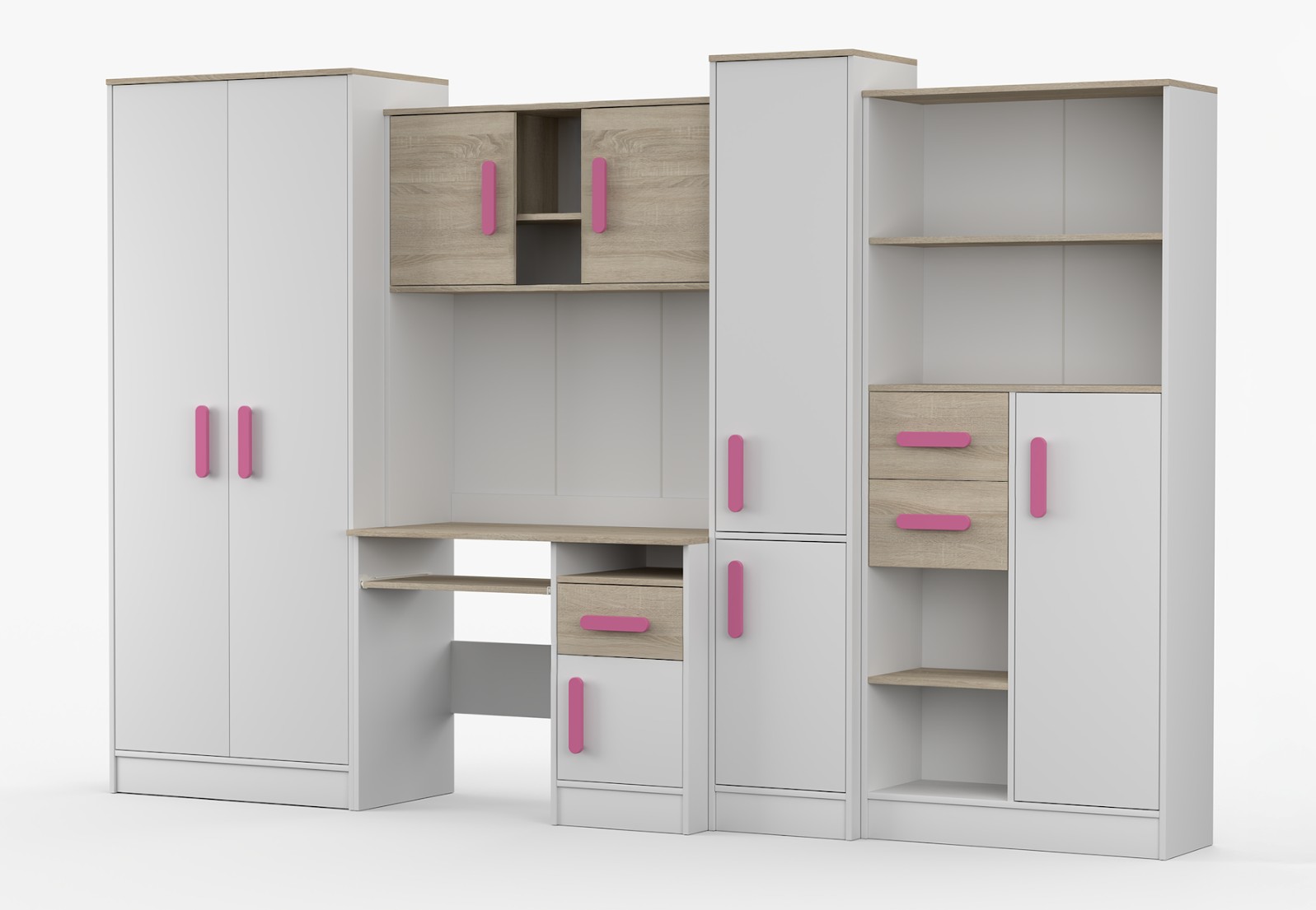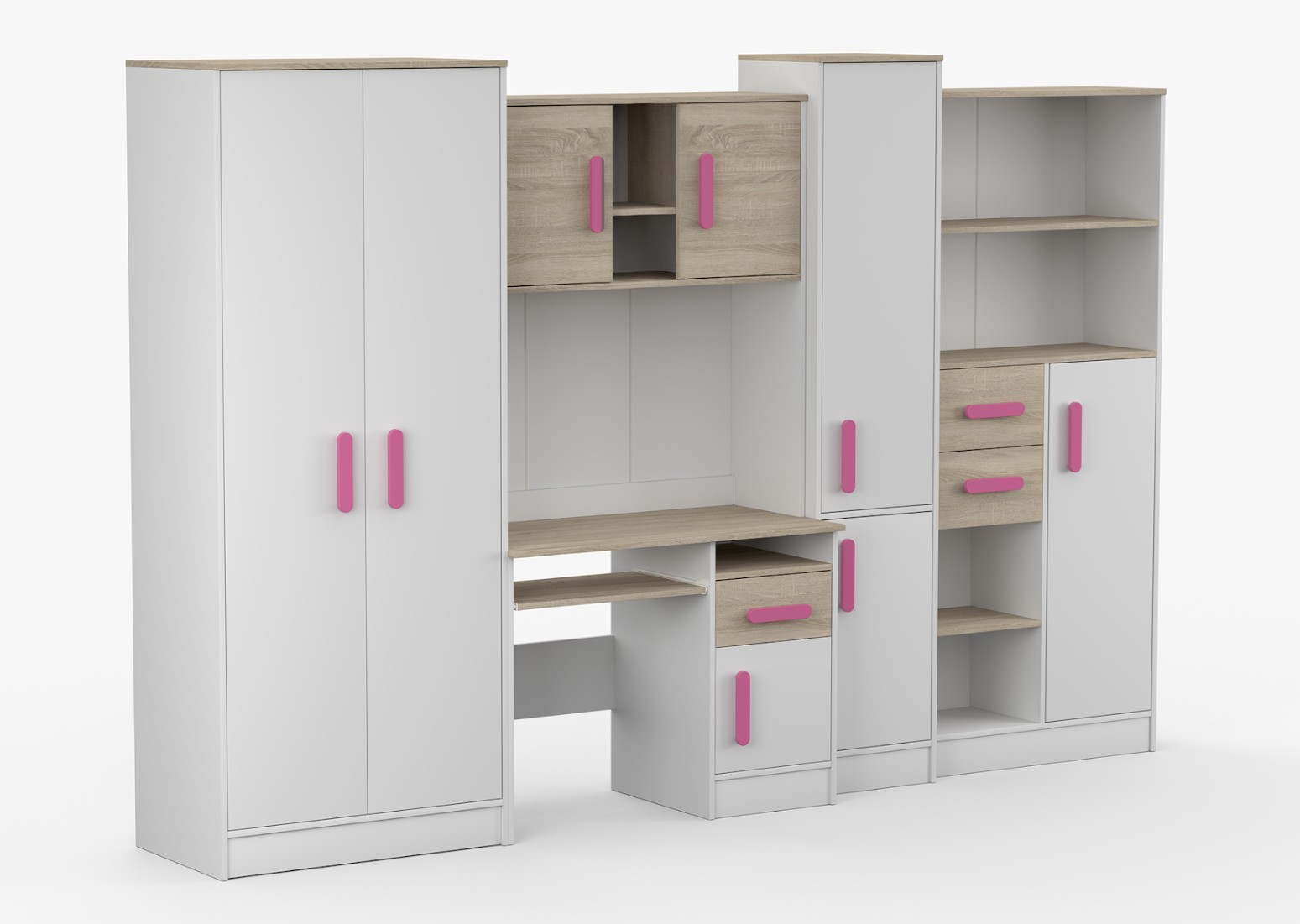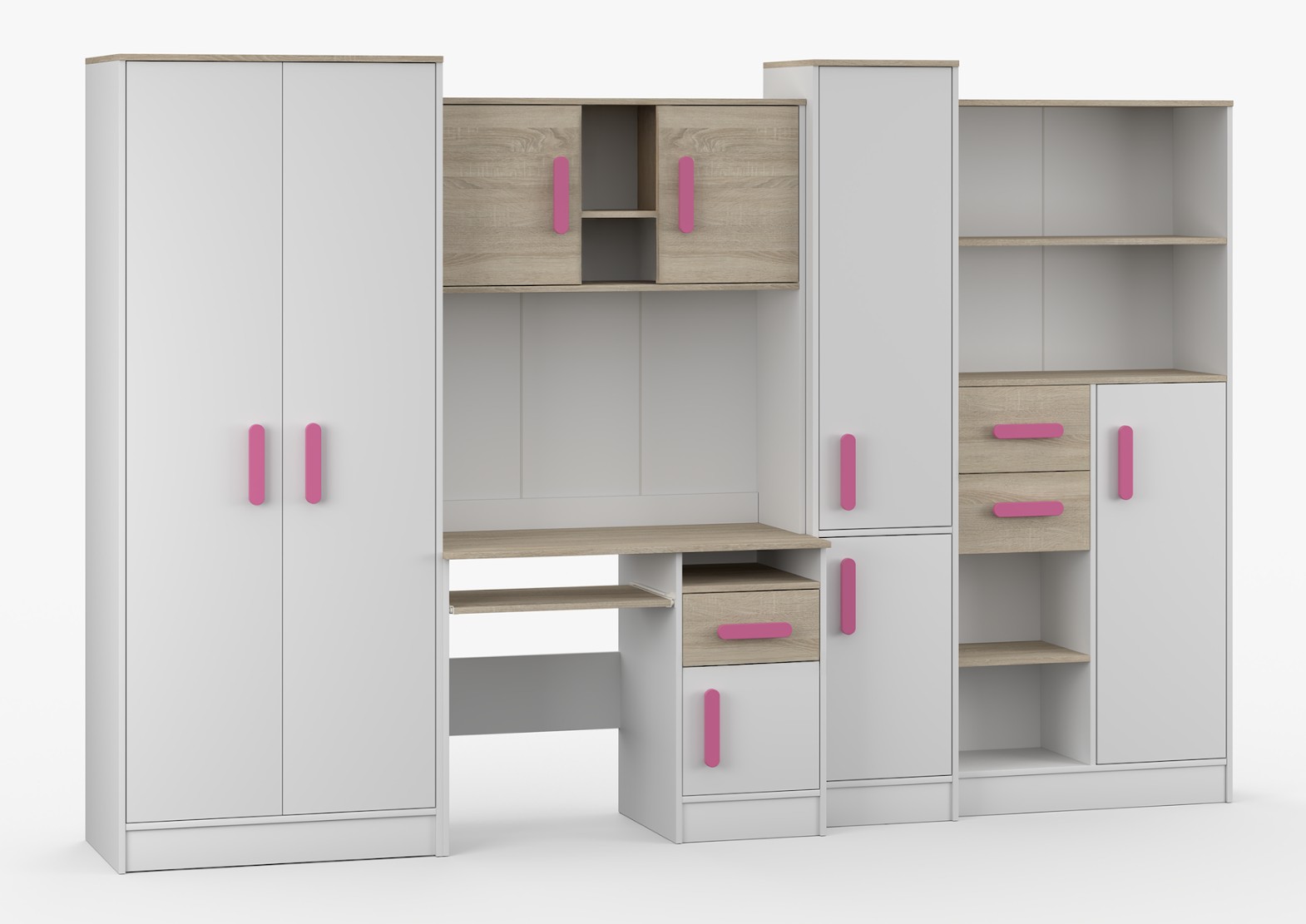 Nábytková stěna SMYK je sada složená z pěti prvků, které jsou nezbytné v každém dětském pokoji nebo pokoji pro studenta. Nejdůležitějším prvkem je psací stůl, který je vybaven prostornou skříňkou a šuplíkem. Má vysouvací polici pro klávesnici a otevřenou polici na drobné příslušenství. Na psacím stole je nástavec rozdělený na část s otevřenými policemi a dvě uzavřené skříňky. Součástí sestavy je také dvoudveřová skříň. Uvnitř skříně najdeme polici a tyč na zavěšení oděvů. Dalšími prvky jsou dva regály vybavené zásuvkami a skříňkami - jeden uzavřený a druhý s otevřenými policemi který poskytuje dostatek úložného prostoru pro knihy, hračky a dekorace. Sestava nemá desku mezi psacím stolem a horní skříňkou.