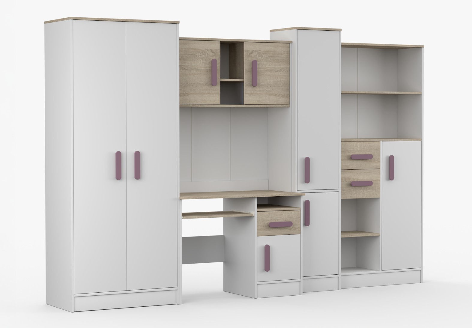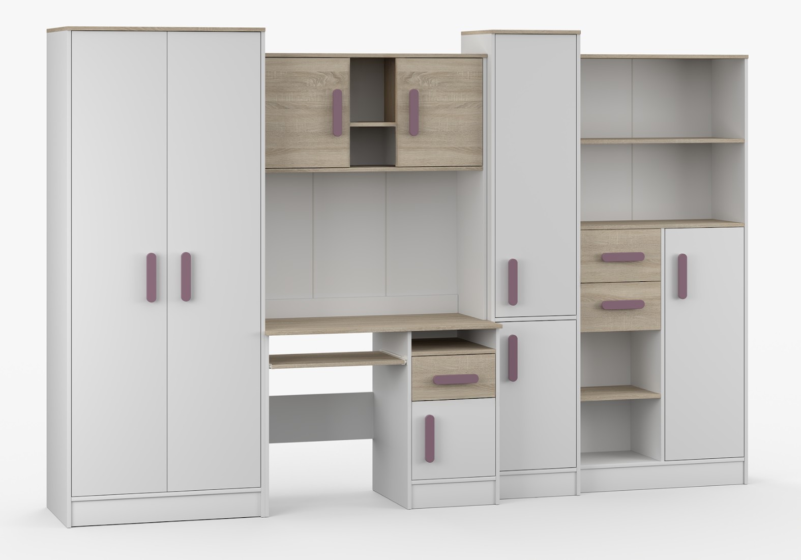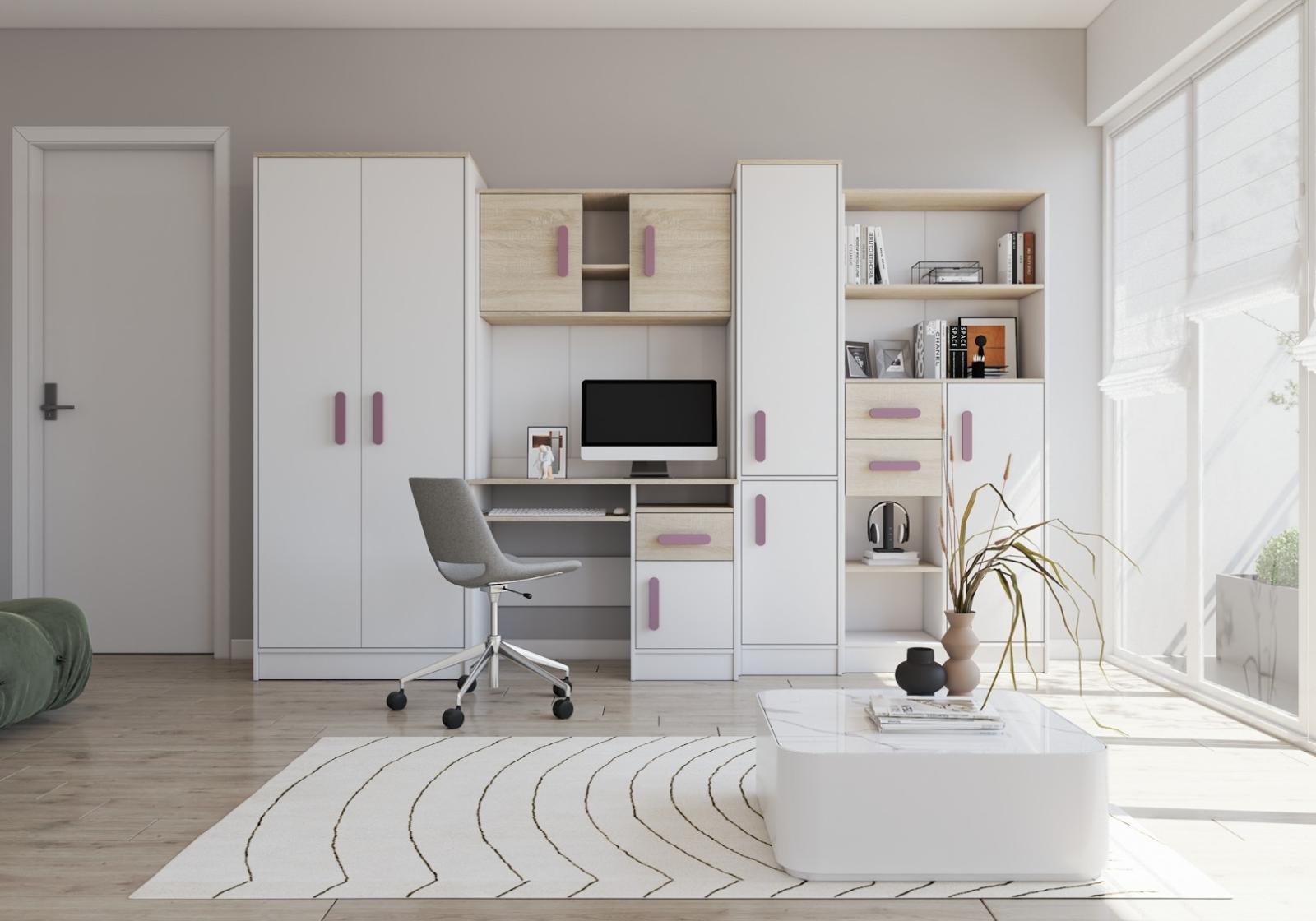 Nábytková stěna SMYK je sada složená z pěti prvků, které jsou nezbytné v každém dětském pokoji nebo pokoji pro studenta. Nejdůležitějším prvkem je psací stůl, který je vybaven prostornou skříňkou a šuplíkem. Má vysouvací polici pro klávesnici a otevřenou polici na drobné příslušenství. Na psacím stole je nástavec rozdělený na část s otevřenými policemi a dvě uzavřené skříňky. Součástí sestavy je také dvoudveřová skříň. Uvnitř skříně najdeme polici a tyč na zavěšení oděvů. Dalšími prvky jsou dva regály vybavené zásuvkami a skříňkami - jeden uzavřený a druhý s otevřenými policemi který poskytuje dostatek úložného prostoru pro knihy, hračky a dekorace. Sestava nemá desku mezi psacím stolem a horní skříňkou.