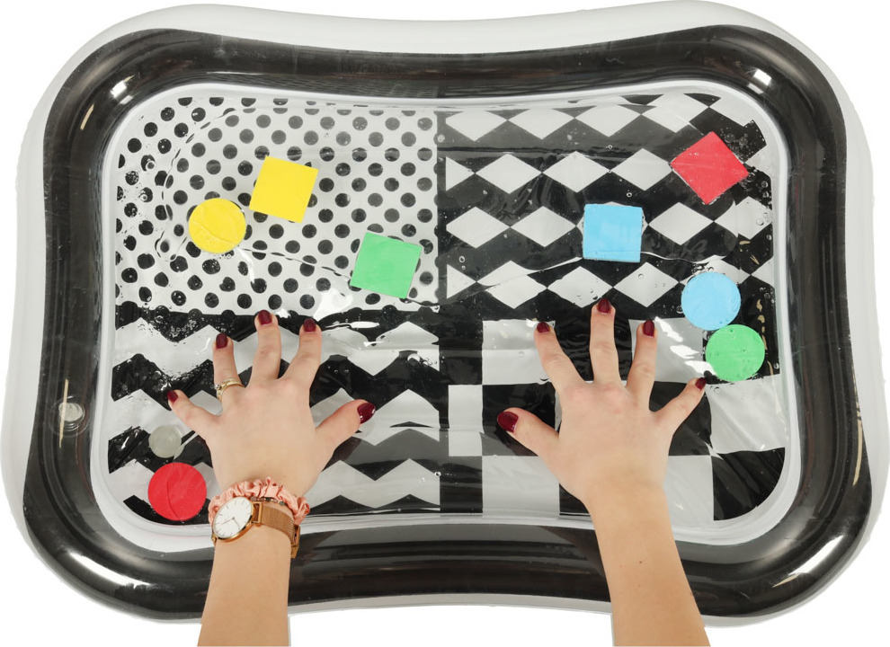 Úžasná senzorická podložka pro děti s kontrastním černobílým vzorem.Uvnitř podložky jsou umístěny barevné geometrické obrazce, které se při pohybu dítěte pohybují. Plovoucí prvky upoutají zájem dítěte a zaměří jeho pozornost. Při ležení na bříšku si dítě procvičuje svaly, které jsou zodpovědné za správné držení těla. Senzorická podložka se velmi snadno používá. Okraj podložky nafoukněte vzduchem a střed naplňte vodou. Pro lepší efekt lze střed naplnit částečně vodou a částečně vzduchem.