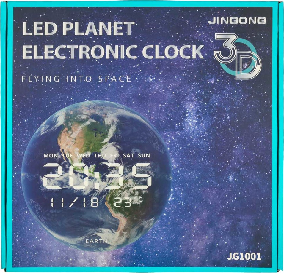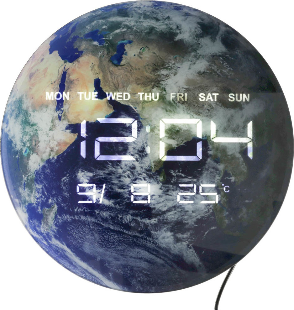 Přineste si do svého domova kousek vesmíru! Moderní nástěnné hodiny s motivem Země jsou nejen praktickým časoměřičem, ale také stylovou dekorací vašeho interiéru! Na LED displeji najdete informace, jako je čas (formát 12/24 h), datum (formát M/D/R), aktuální den v týdnu a teplota (°C) v místnosti. Po nastavení data bude symbol označující aktuální den v týdnu (anglická zkratka) nepřetržitě blikat. Ať už se rozhodnete pro montáž na zeď nebo na stojan, grafika Země bude vždy poutat pozornost. Je to univerzální dekorativní kousek, který se hodí do každého interiéru! Hodiny jsou napájeny přiloženým síťovým kabelem. Kromě toho jsou vybaveny baterií CR2032 (rovněž součástí dodávky), která slouží k zachování nastavení data a času v případě dočasného výpadku proudu.