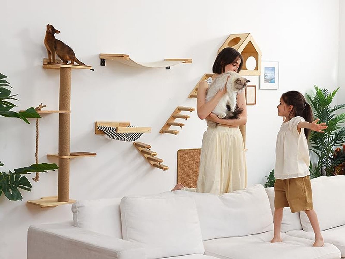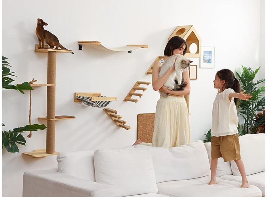 Schody pro kočky na zeď jsou skvělým řešením, které vašemu chlupatému kamarádovi umožní snadný přístup k jeho oblíbeným místům. Vyrobeny z masivního dřeva a polstrované sisalovým lanem, zajišťují odolnost a bezpečnost. Sisalová šňůra také funguje jako přírodní škrabadlo drápů, které udržuje drápy vaší kočky zdravé. Sada obsahuje vše, co potřebujete pro snadnou montáž, a to díky speciální montážní sadě. Schůdky nejen usnadňují přístup k policím nebo parapetům, ale díky svému estetického designu představují také stylový doplněk interiéru. Dopřejte své kočce pohodlí a nezávislosti a zároveň dodejte svému domovu eleganci díky schůdkům u kočičí zdi.