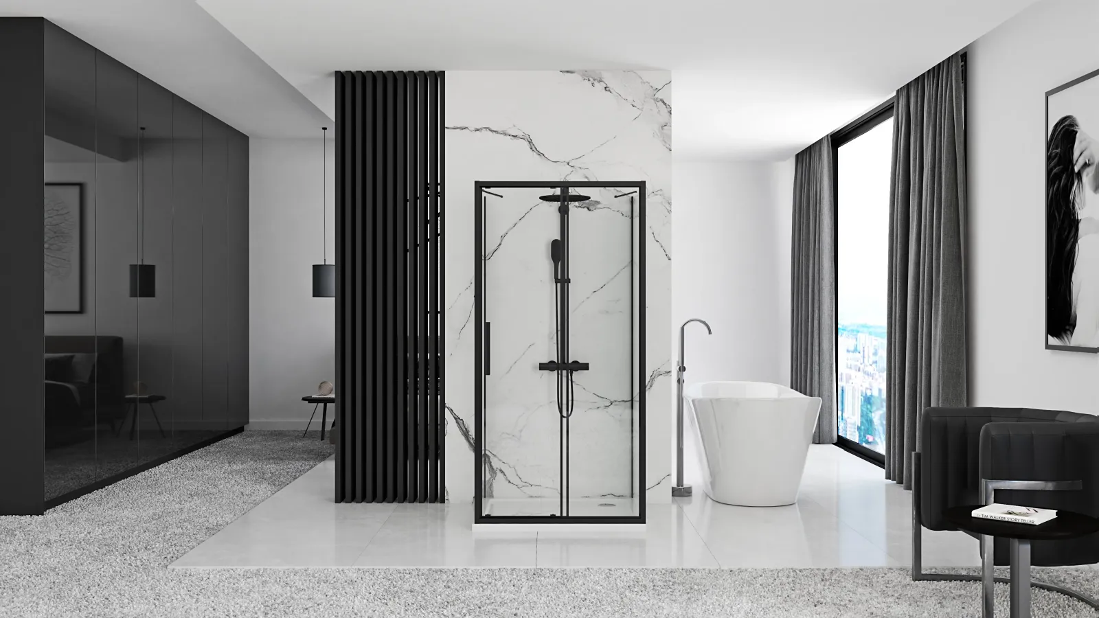 Stěny koutu jsou uchyceny v černých hliníkových profilech a jsou vybaveny magnetickým uzavíráním a spodním těsněním. Díky regulaci v profilech lze vyrovnat mírné nerovnosti stěn. Podlahová lišta o výšce 10 mm zamezí vytékání vody pod dveřmi.