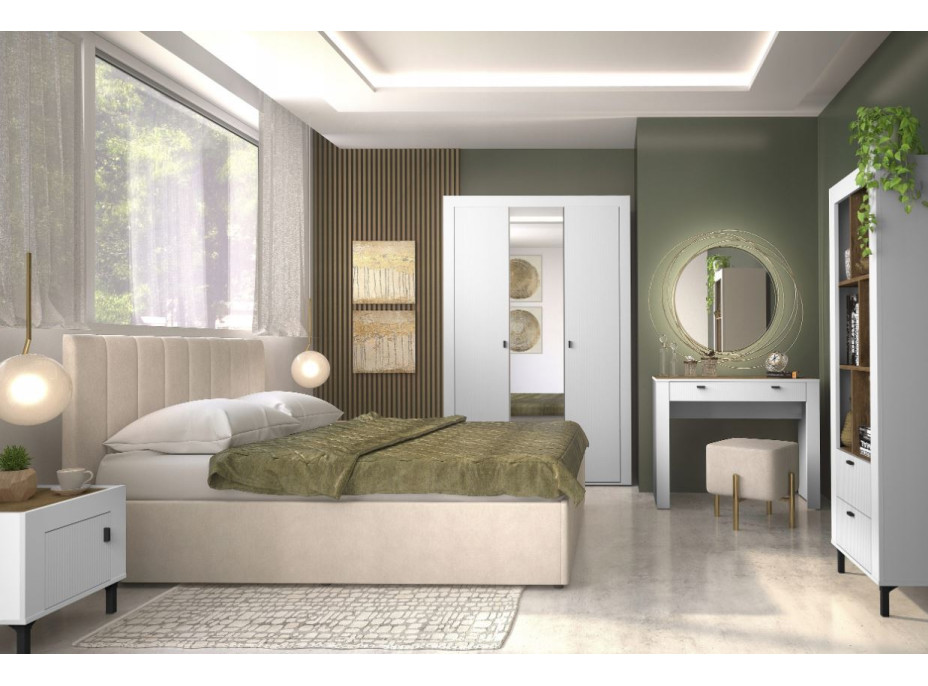 Praktický noční stolek z kolekce MOSSA se skvěle hodí do ložnic zařízených v moderním, klasickém i glamour stylu. Produkty z kolekce MOSSA nabízíme ve třech variantách barevného provedení, a to v kombinaci bílé, černé nebo kašmírové barvy s odstínem dubu v dekoru whisky. Kolekce MOSSA je velmi moderní, kombinuje funkčnost a styl. Použití speciální textury čel a zapuštěných pracovních desek dodává celé kolekci eleganci a jedinečnost.