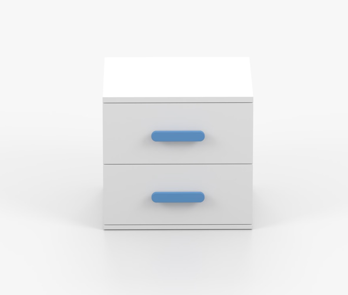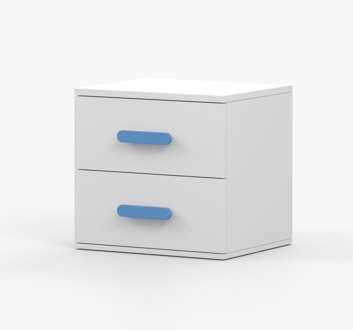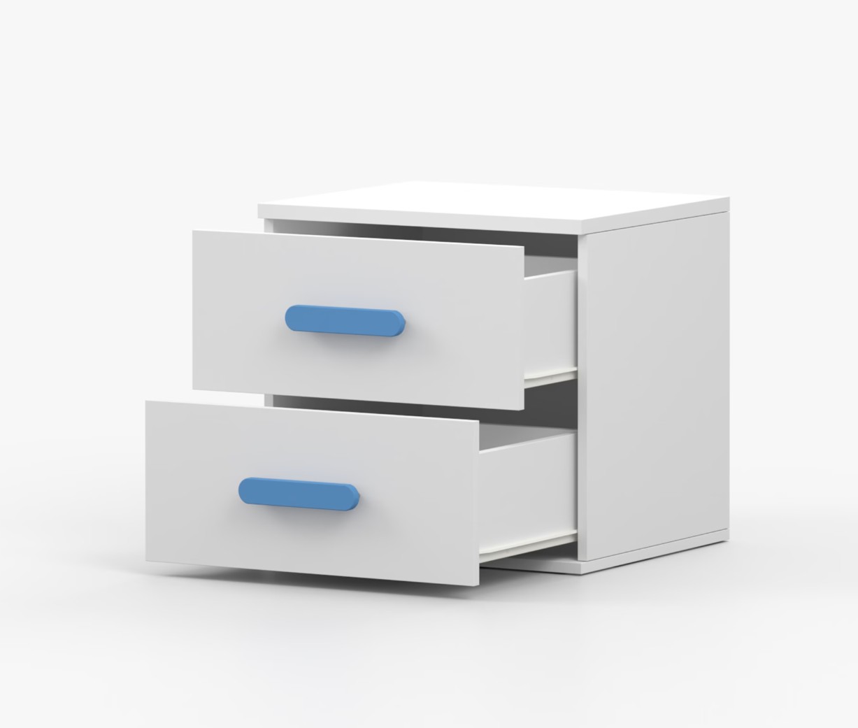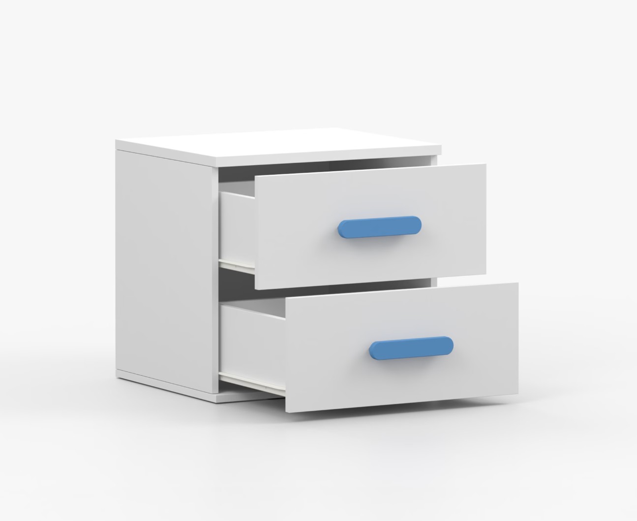 Noční stolek SCOUT je moderní a praktický kus nábytku, vyrobený z kvalitní 16mm laminované desky v bílém dekoru. Hrany jsou ohraněny odolnou ABS lištou, která je chrání před mechanickým poškozením. Stolek má dvě prostorné zásuvky s dřevěnými barevnými úchytkami. Jeho nadčasový design se hodí do různých typů interiérů, například do dětského pokoje nebo pokoje pro studenta.