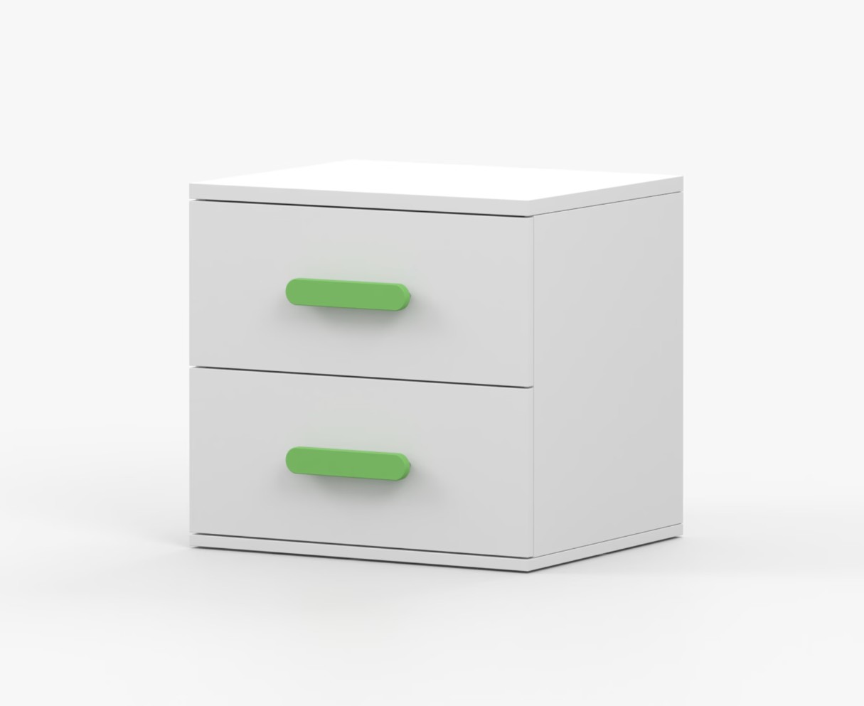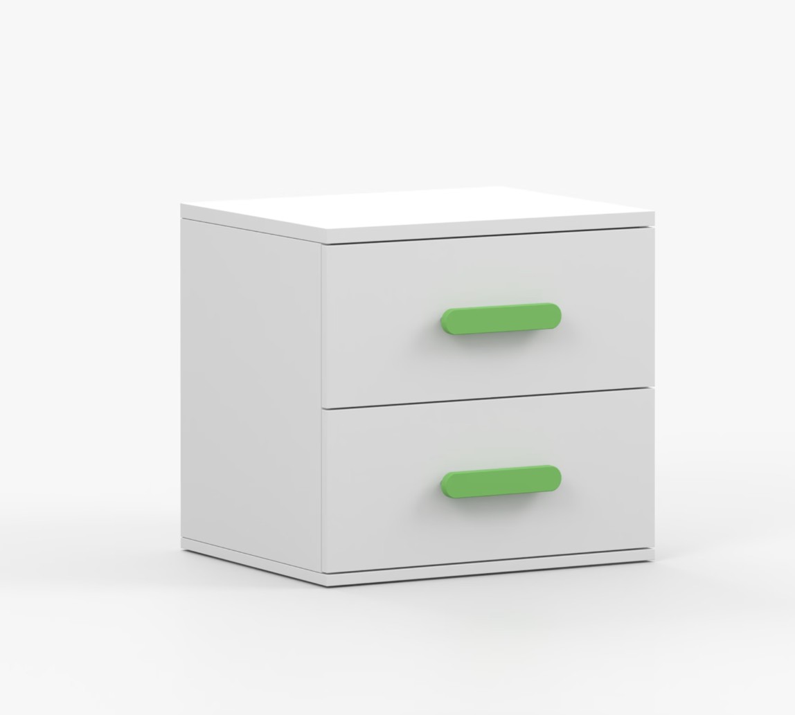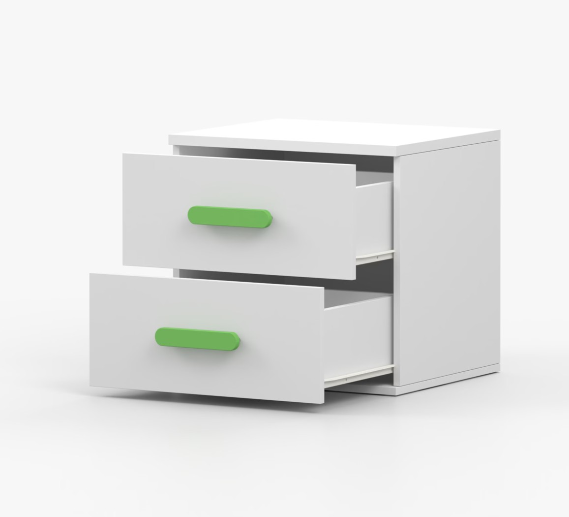 Noční stolek SCOUT je moderní a praktický kus nábytku, vyrobený z kvalitní 16mm laminované desky v bílém dekoru. Hrany jsou ohraněny odolnou ABS lištou, která je chrání před mechanickým poškozením. Stolek má dvě prostorné zásuvky s dřevěnými barevnými úchytkami. Jeho nadčasový design se hodí do různých typů interiérů, například do dětského pokoje nebo pokoje pro studenta.