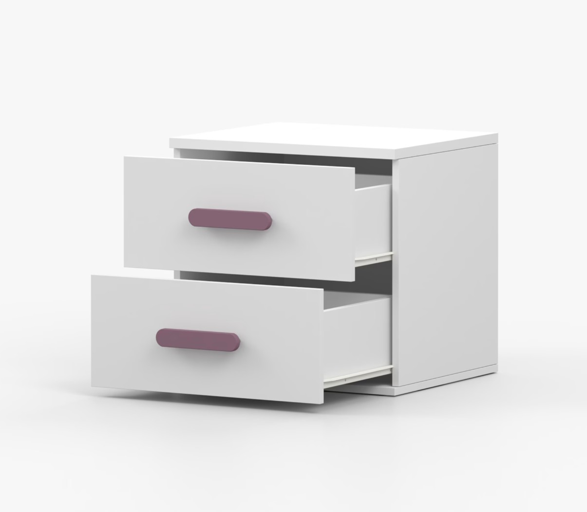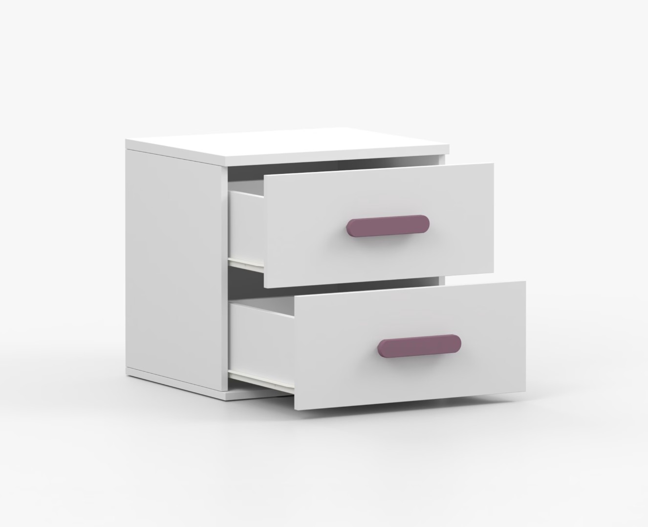 Noční stolek SCOUT je moderní a praktický kus nábytku, vyrobený z kvalitní 16mm laminované desky v bílém dekoru. Hrany jsou ohraněny odolnou ABS lištou, která je chrání před mechanickým poškozením. Stolek má dvě prostorné zásuvky s dřevěnými barevnými úchytkami. Jeho nadčasový design se hodí do různých typů interiérů, například do dětského pokoje nebo pokoje pro studenta.