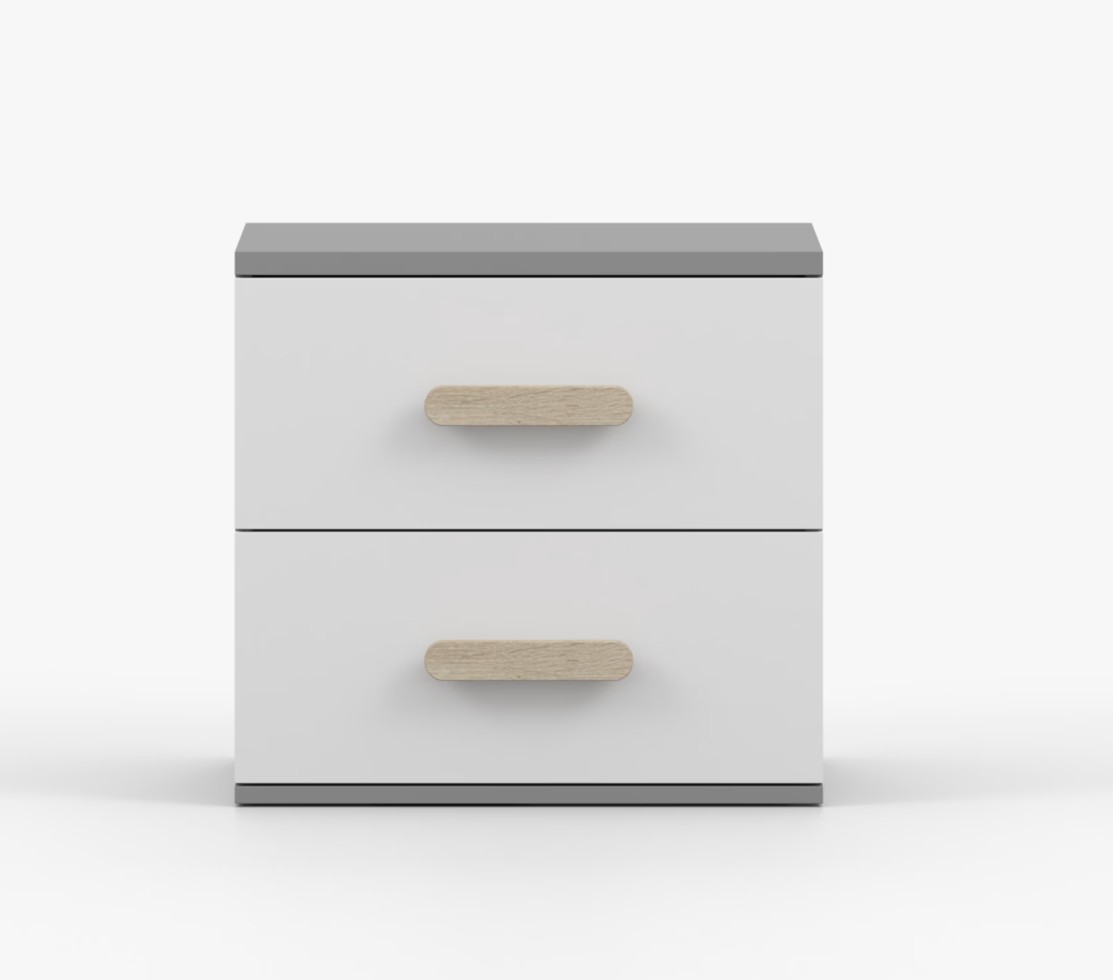 Noční stolek SCOUT je moderní a praktický kus nábytku, vyrobený z kvalitní 16mm laminované desky v šedém odstínu. Hrany jsou ohraněny odolnou ABS lištou, která je chrání před mechanickým poškozením. Stolek má dvě prostorné zásuvky s dřevěnými barevnými úchytkami. Jeho nadčasový design se hodí do různých typů interiérů, například do dětského pokoje nebo pokoje pro studenta.