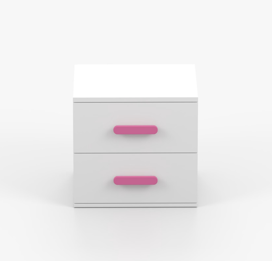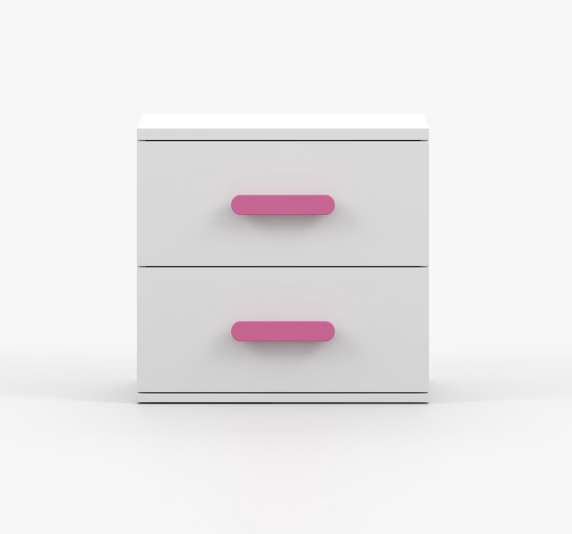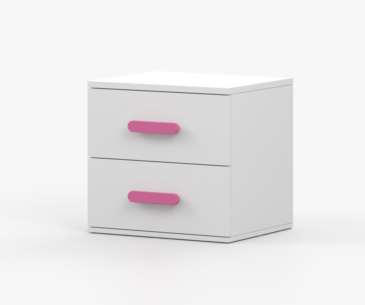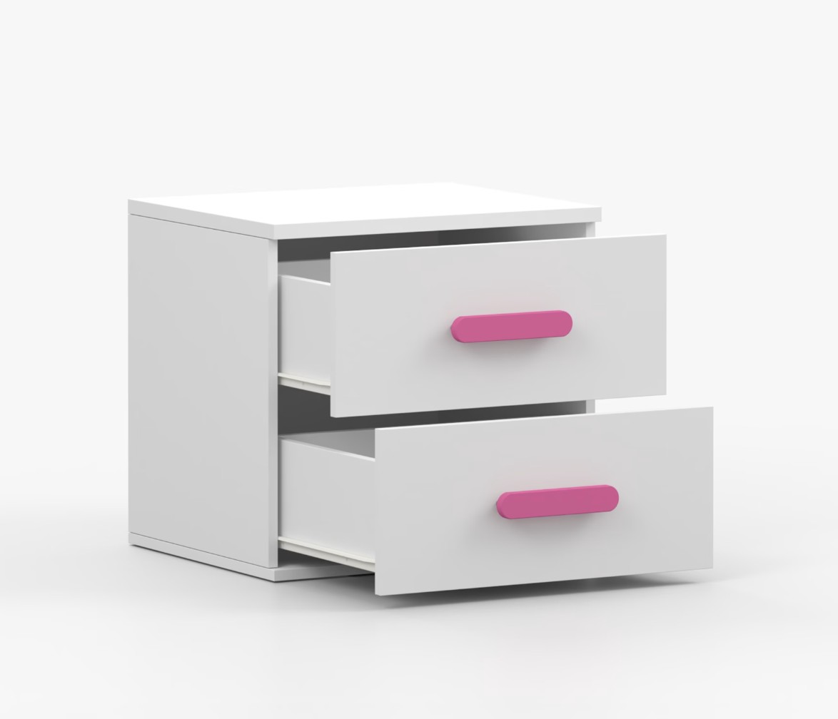 Noční stolek SMYK je moderní a praktický kus nábytku, vyrobený z kvalitní 16mm laminované desky v bílém dekoru. Hrany jsou ohraněny odolnou ABS lištou, která je chrání před mechanickým poškozením. Stolek má dvě prostorné zásuvky s dřevěnými barevnými úchytkami. Jeho nadčasový design se hodí do různých typů interiérů, například do dětského pokoje nebo pokoje pro studenta.