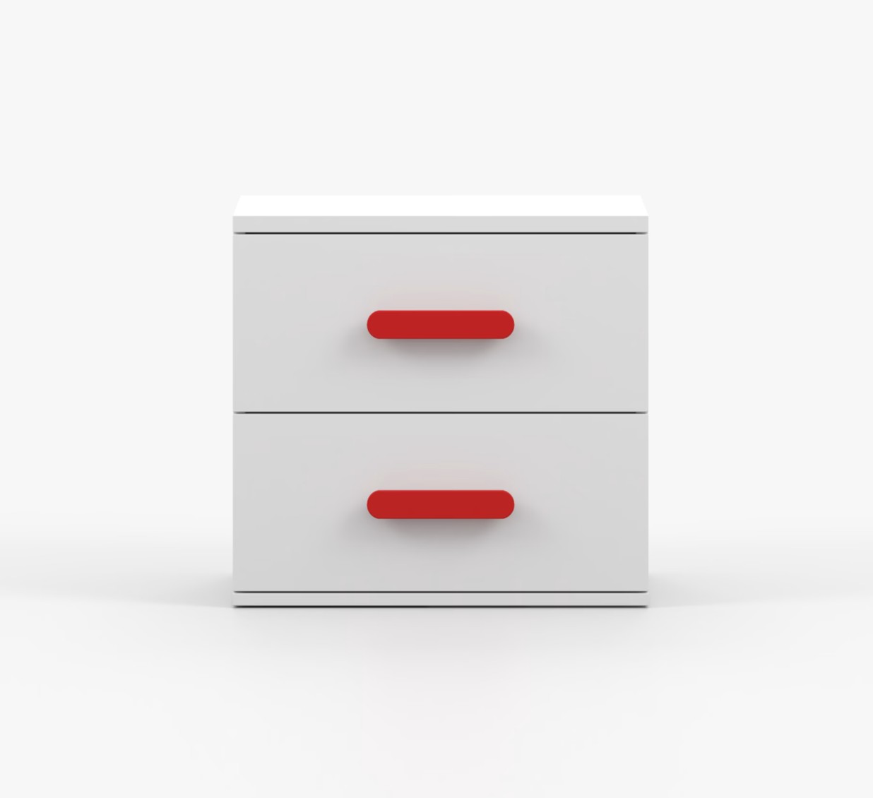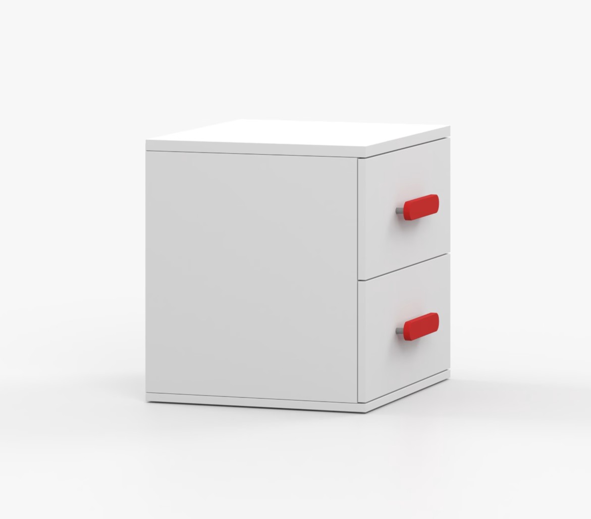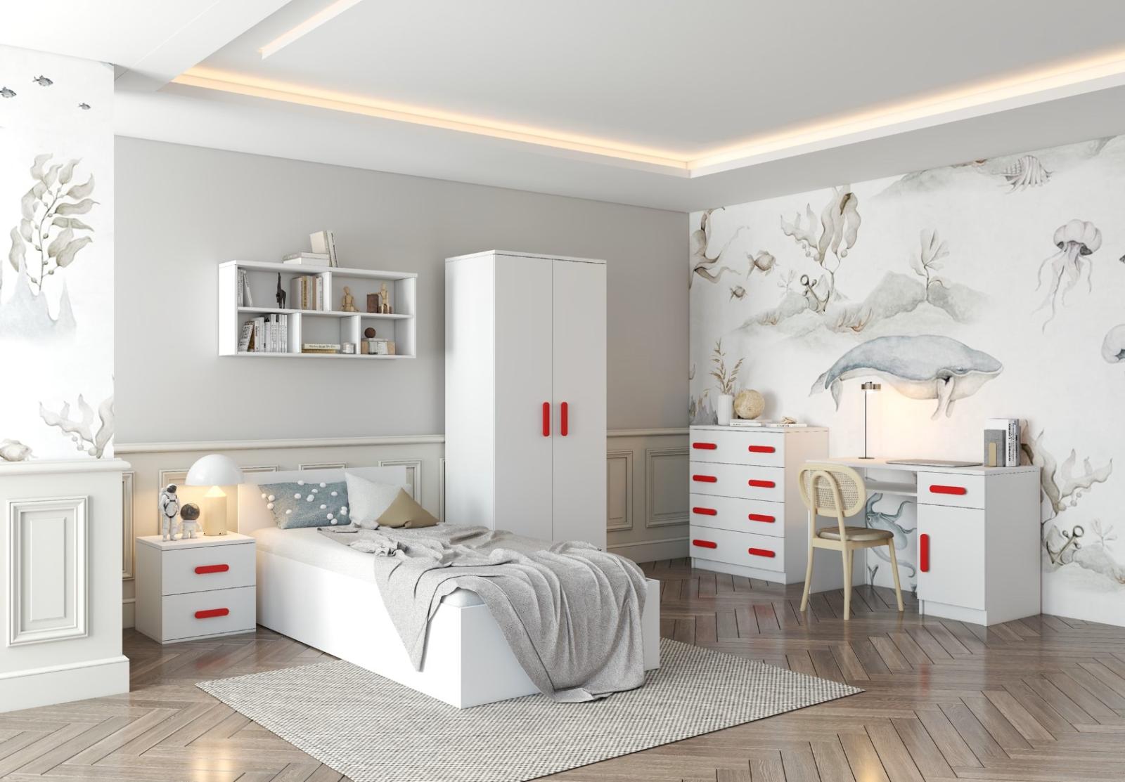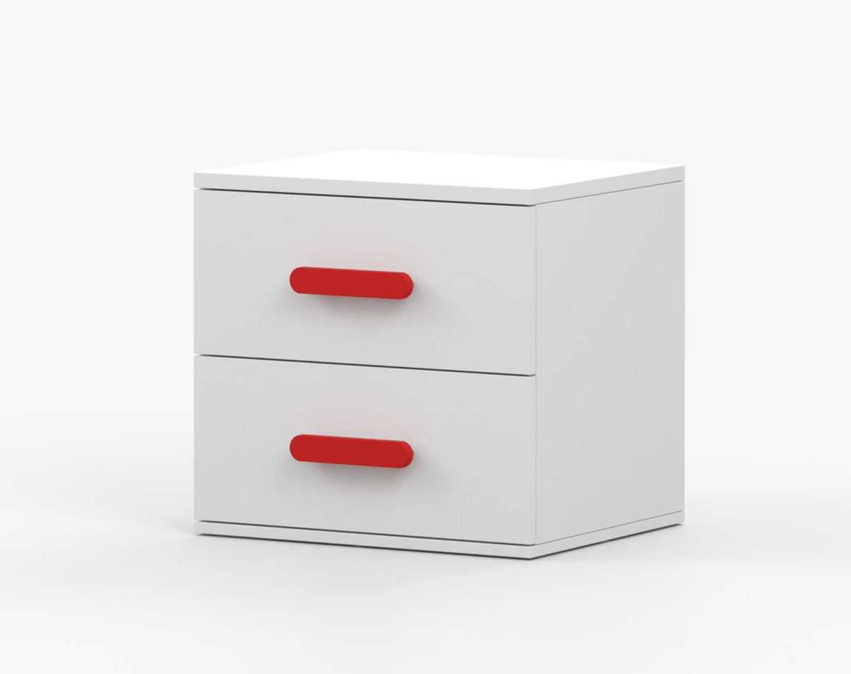 Noční stolek SMYK je moderní a praktický kus nábytku, vyrobený z kvalitní 16mm laminované desky v bílém dekoru. Hrany jsou ohraněny odolnou ABS lištou, která je chrání před mechanickým poškozením. Stolek má dvě prostorné zásuvky s dřevěnými barevnými úchytkami. Jeho nadčasový design se hodí do různých typů interiérů, například do dětského pokoje nebo pokoje pro studenta.