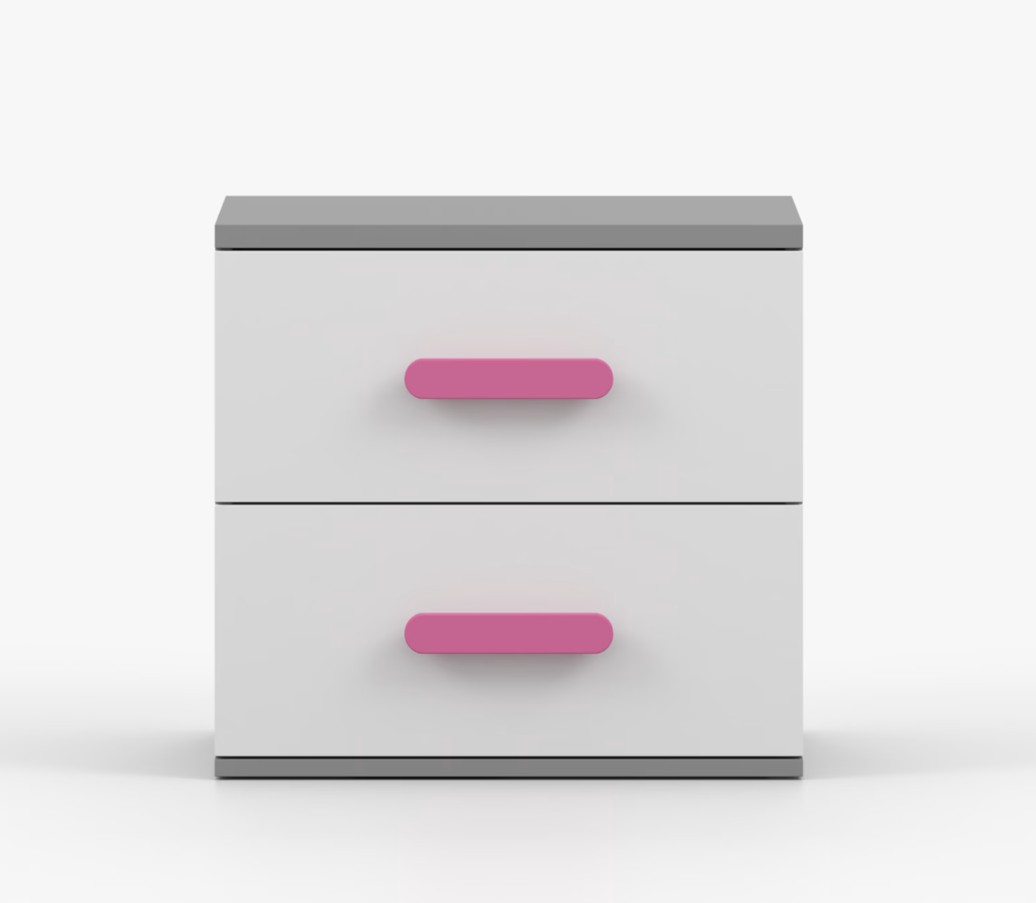 Noční stolek SMYK je moderní a praktický kus nábytku, vyrobený z kvalitní 16mm laminované desky v šedém odstínu. Hrany jsou ohraněny odolnou ABS lištou, která je chrání před mechanickým poškozením. Stolek má dvě prostorné zásuvky s dřevěnými barevnými úchytkami. Jeho nadčasový design se hodí do různých typů interiérů, například do dětského pokoje nebo pokoje pro studenta.
