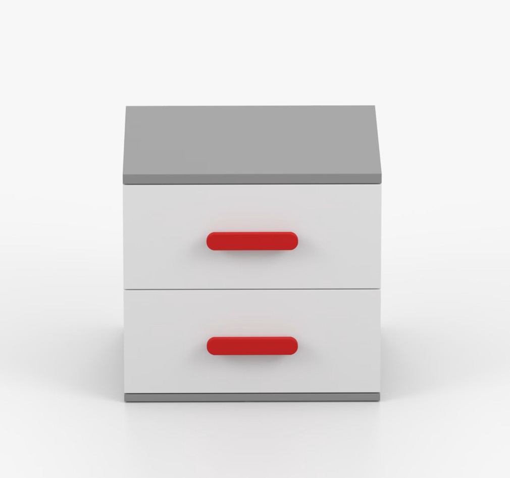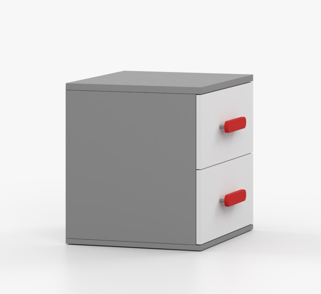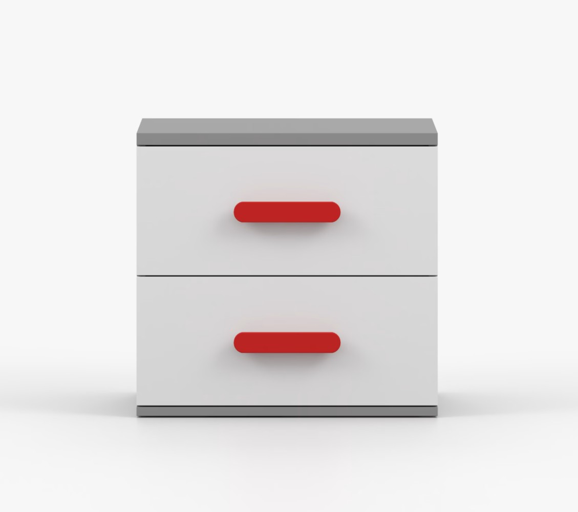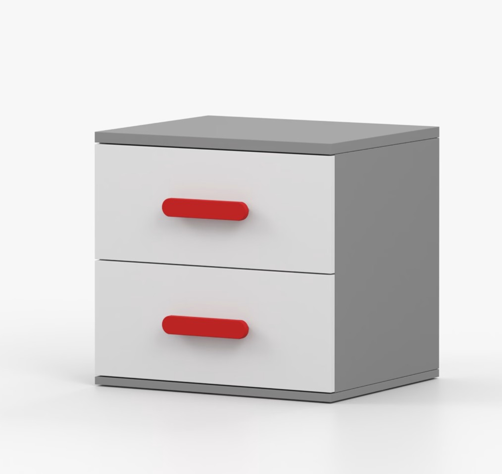 Noční stolek SMYK je moderní a praktický kus nábytku, vyrobený z kvalitní 16mm laminované desky v šedém odstínu. Hrany jsou ohraněny odolnou ABS lištou, která je chrání před mechanickým poškozením. Stolek má dvě prostorné zásuvky s dřevěnými barevnými úchytkami. Jeho nadčasový design se hodí do různých typů interiérů, například do dětského pokoje nebo pokoje pro studenta.