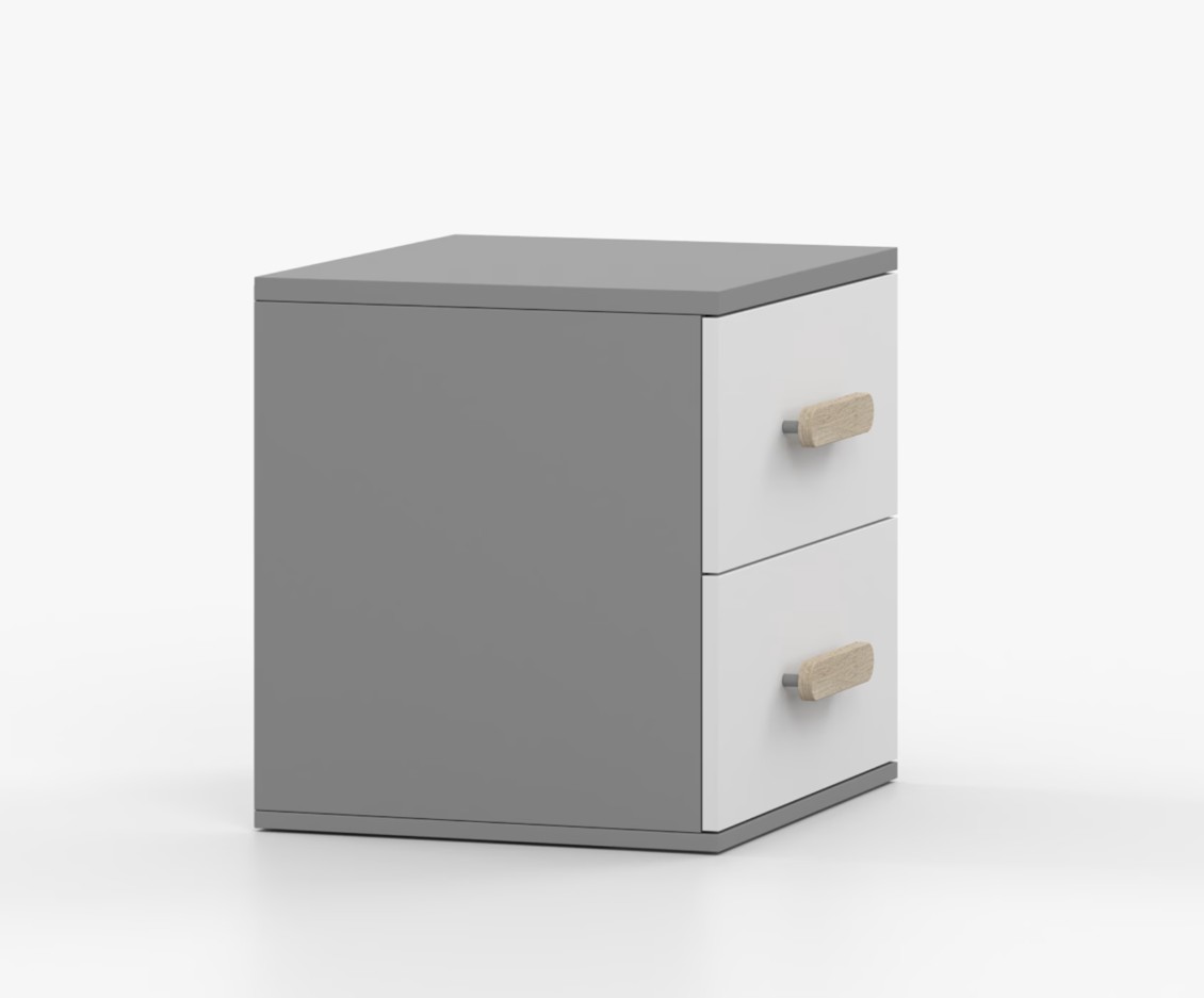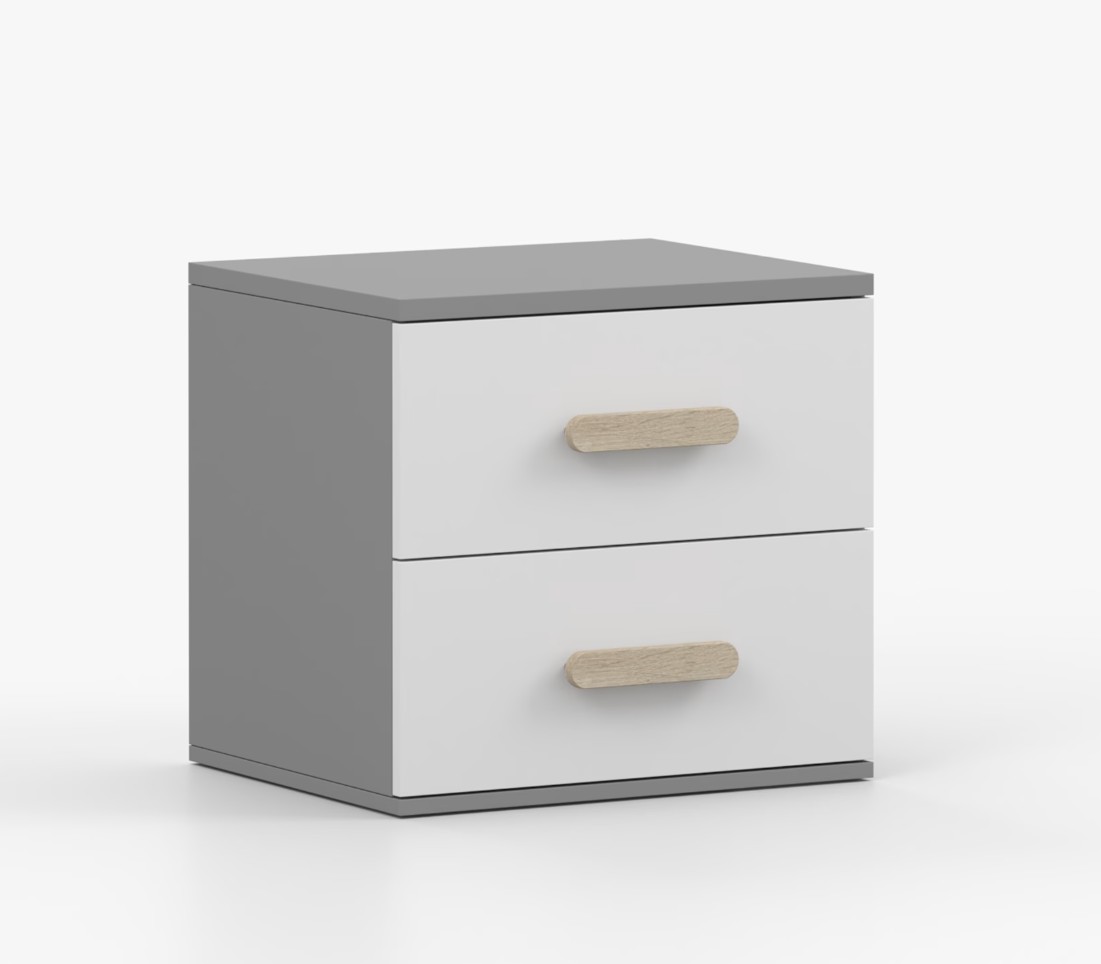 Noční stolek SMYK je moderní a praktický kus nábytku, vyrobený z kvalitní 16mm laminované desky v šedém odstínu. Hrany jsou ohraněny odolnou ABS lištou, která je chrání před mechanickým poškozením. Stolek má dvě prostorné zásuvky s dřevěnými barevnými úchytkami. Jeho nadčasový design se hodí do různých typů interiérů, například do dětského pokoje nebo pokoje pro studenta.