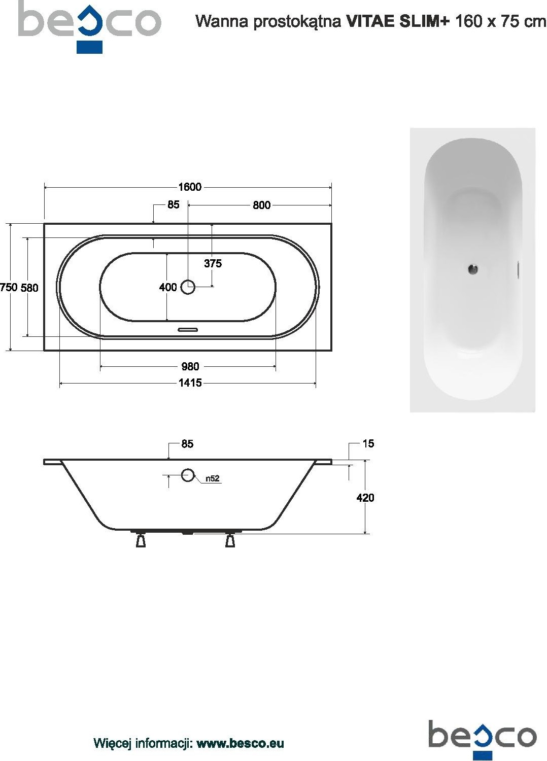 Designově jednoduchá vana VITAE SLIM+ s velmi nízkou hranou (pouhých 15 mm) a s dokonalou rovností okrajů je určena pro menší i větší koupelny. Vana VITAE SLIM+ s velkými vnitřními rozměry, která nabízí oboustranné velmi pohodlné ležení a přepad s podélnou štěrbinou. Sifon v barvě CHROM je součástí vany. Obdélníková vana VITAE SLIM+ vyniká vysoce kvalitním zpracováním a spolehlivou funkčností všech součástí a materiálů.