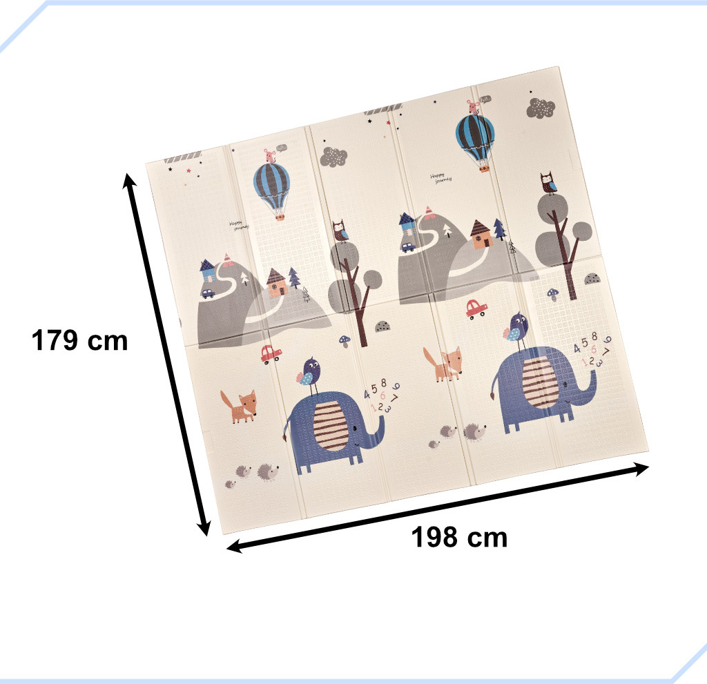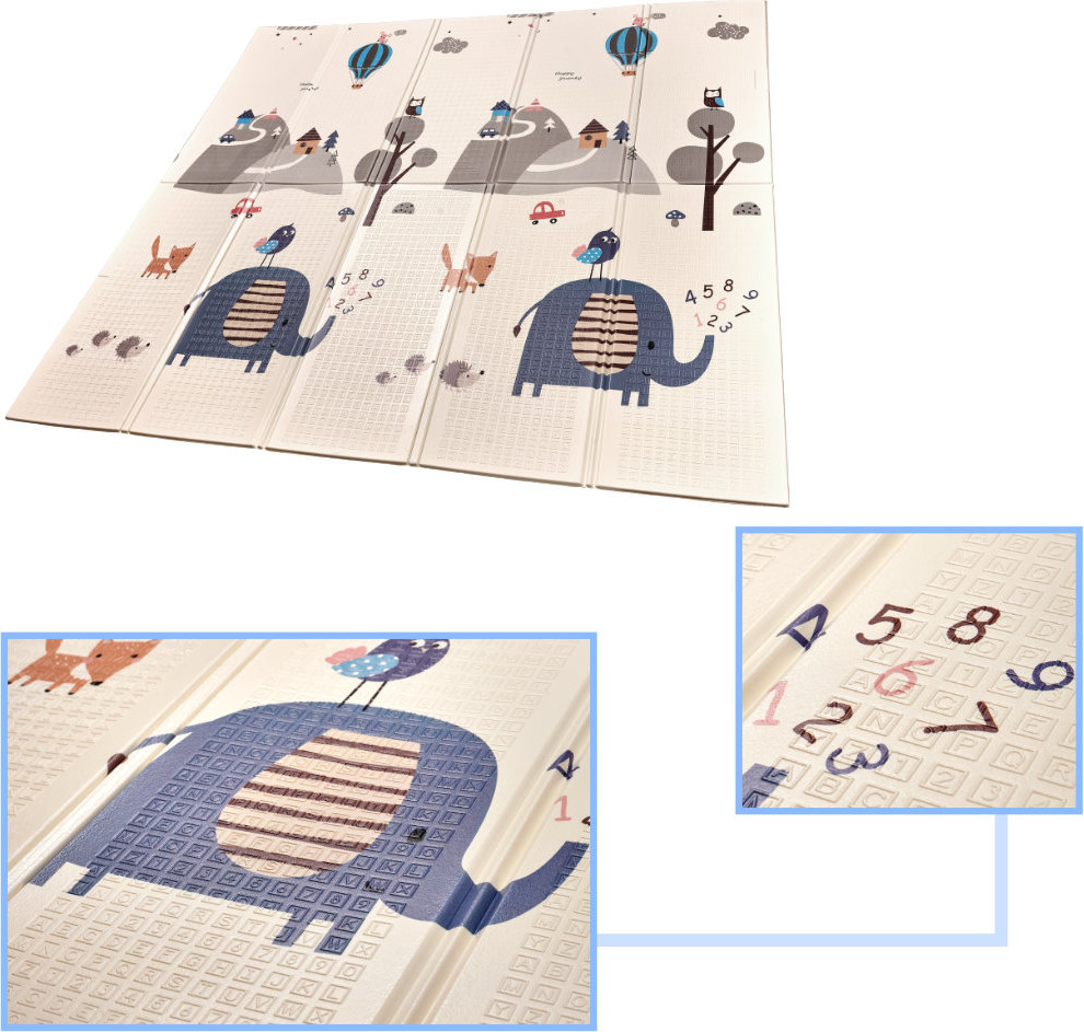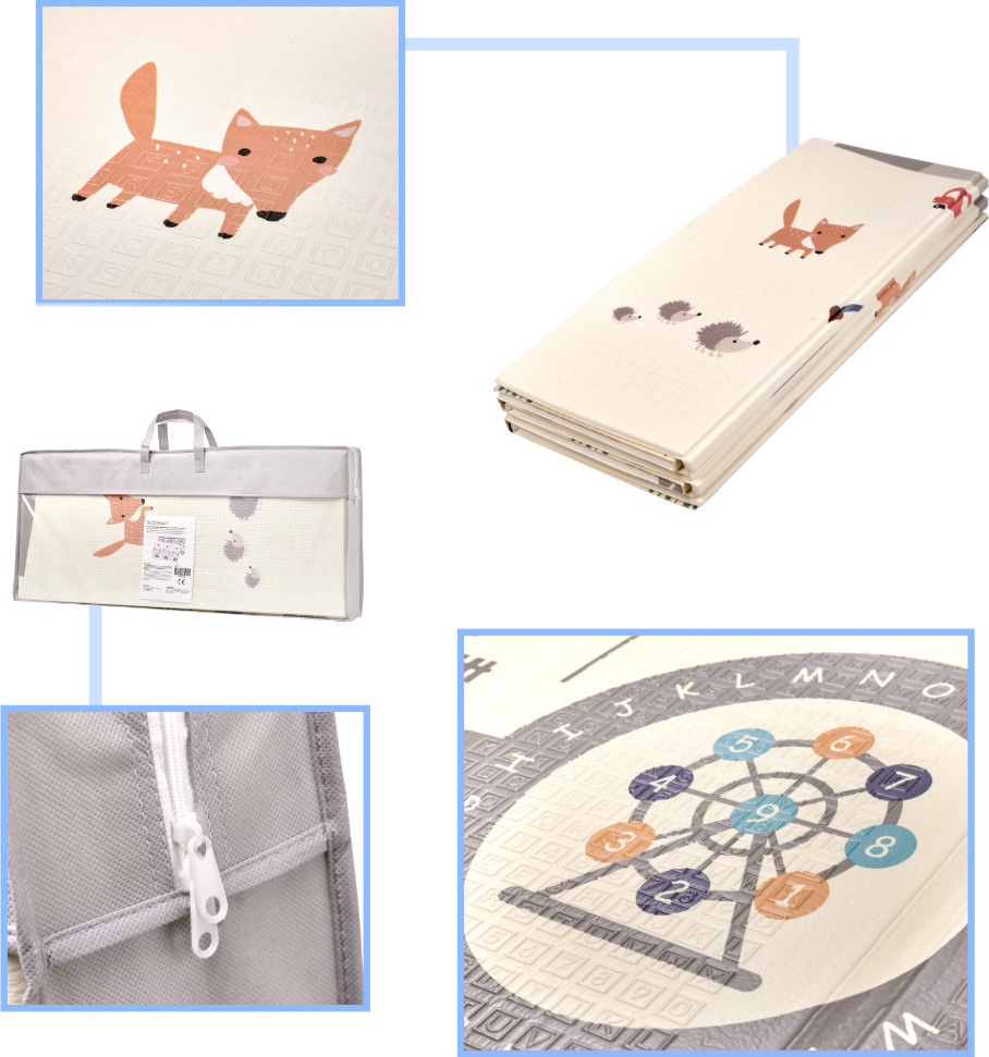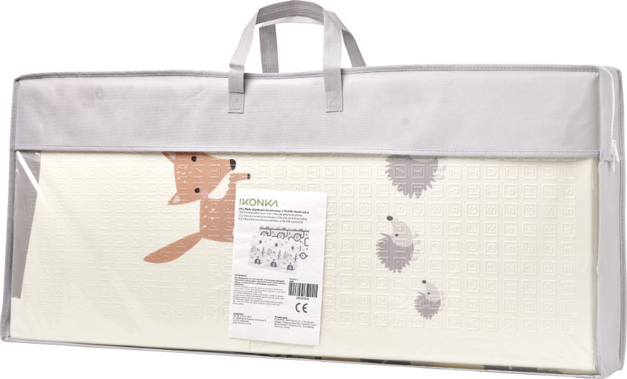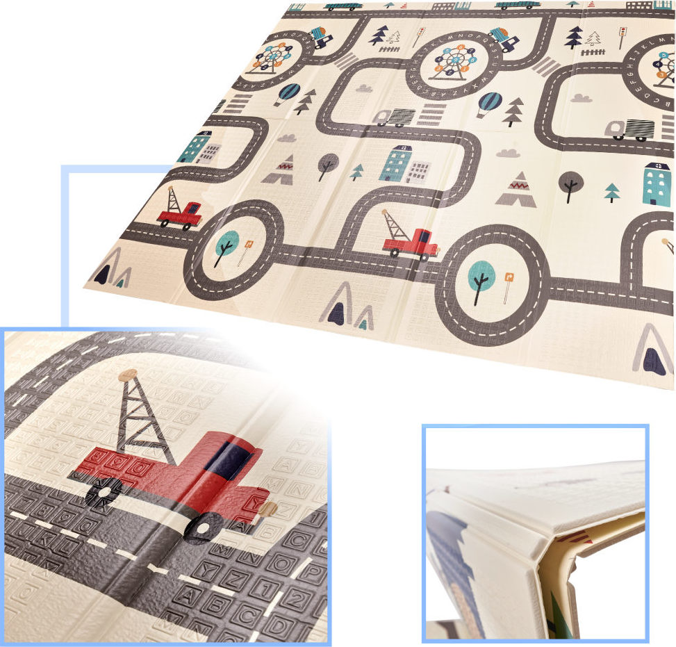 Tato oboustranná pěnová rohožka je perfektním doplňkem do dětského pokoje. Umožňuje vám vyhradit si hrací koutek a zároveň usnadňuje udržování pořádku. Podložka se vyznačuje okouzlující grafikou – jedna strana zobrazuje krajinu se zvířaty a druhá ulici, kde si vaše ratolest může projet autíčkem. Pěnová rohožka o tloušťce 1 centimetr chrání před studenou podlahou a zabraňuje bolestivým pádům při učení se chůze.