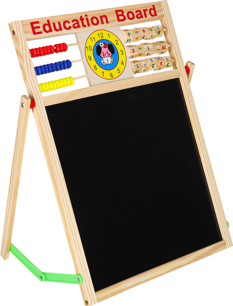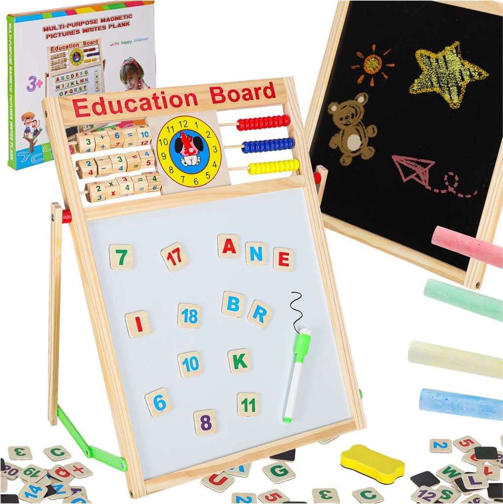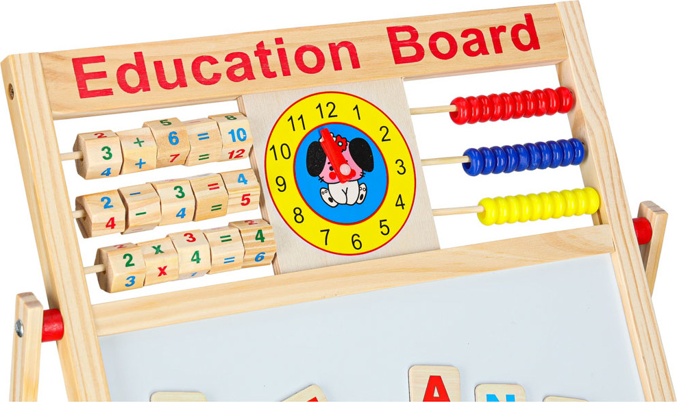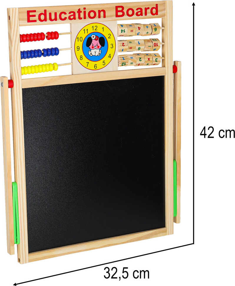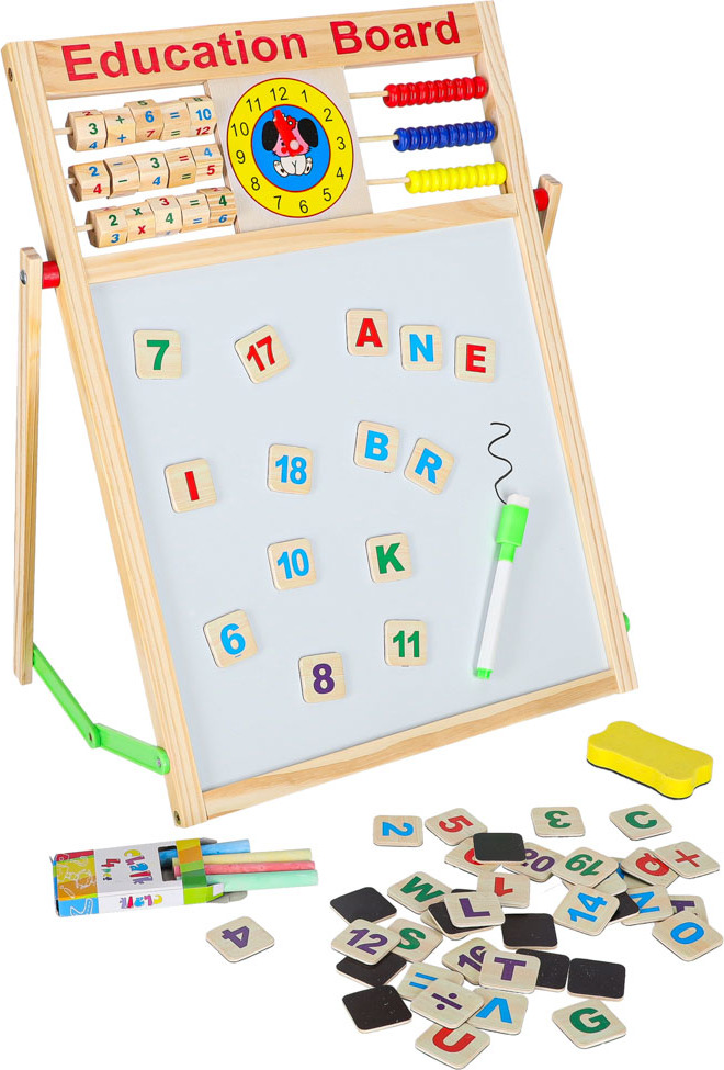 Tato multifunkční magnetická tabule je vynikající vzdělávací hračkou. Stabilní rám tabule je vyroben výhradně ze dřeva. Tabule je ideální pro psaní a kreslení křídou. Bílá strana je ideální pro psaní fixy. Lze na ni také připevnit magnety. Bude perfektní jako učební pomůcka v předškolním věku nebo ve škole. Tabule je vybavena počítadlem a hodinami. Prostřednictvím hry se děti naučí čísla a písmena a rozvíjejí počítací dovednosti. Kromě toho jim tato sada pomůže rychle a snadno si představit pravidla určování času a základy matematiky. Skvělý dárek pro každé dítě, stimulující kreativitu a logické myšlení.