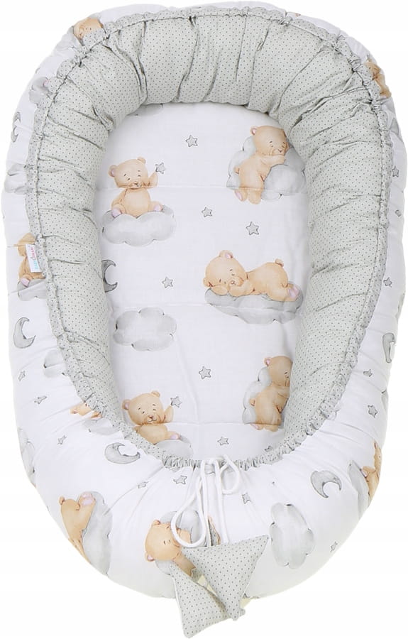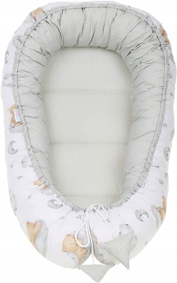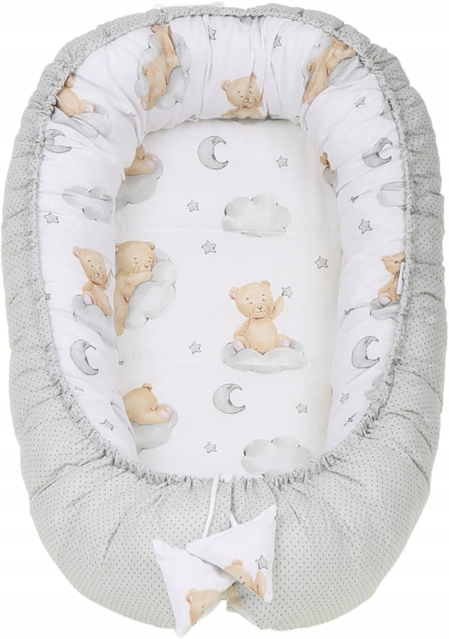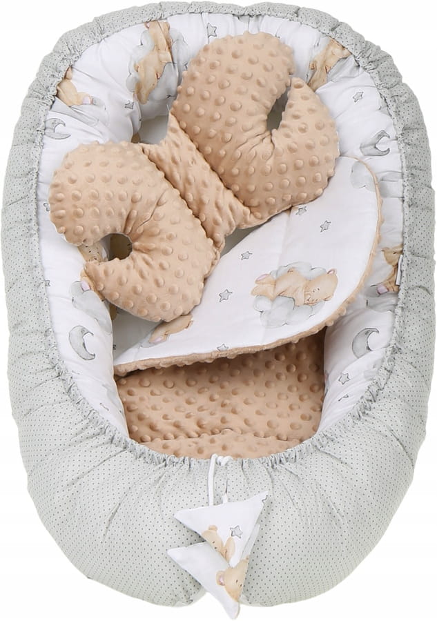 - Oboustranné hnízdečko (kokon) o rozměrech cca 105x65x14 cm, materiál bavlna. Navozuje miminkům pocit bezpečí, kopíruje tvar mámina těla a děťátko se tak cítí spokojeně jako u maminky v bříšku.