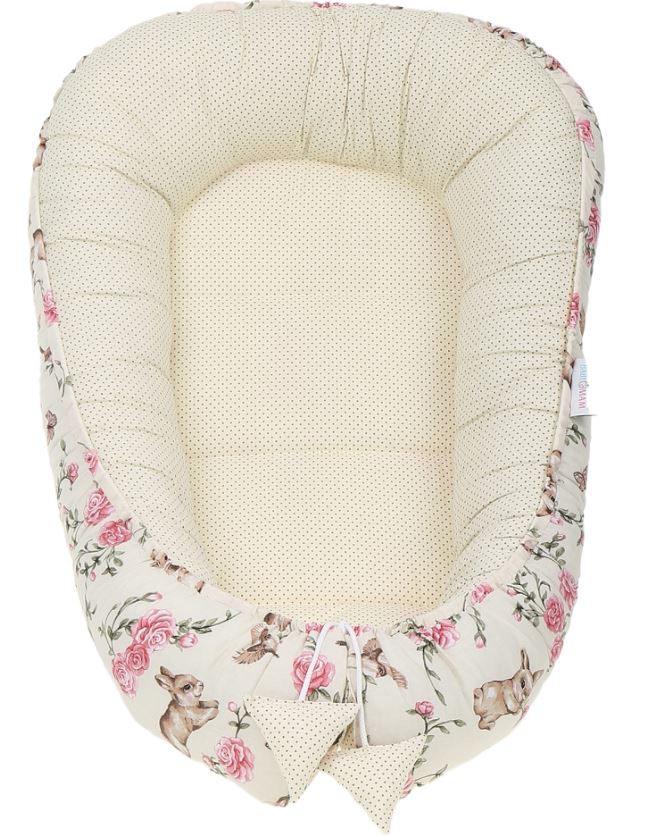 - Oboustranné hnízdečko (kokon) o rozměrech cca 105x65x14 cm, materiál bavlna. Navozuje miminkům pocit bezpečí, kopíruje tvar mámina těla a děťátko se tak cítí spokojeně jako u maminky v bříšku.