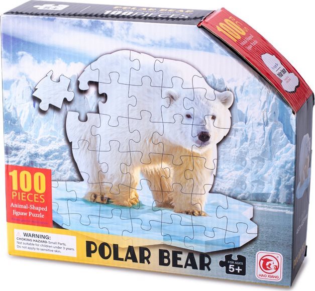 Puzzle ve tvaru ledního medvěda. Okrajové dílky mají unikátní tvary. Součástí balení je předloha skládaného motivu. Rozměr složeného puzzle cca 48,3 x 42,2 cmVlastnosti
