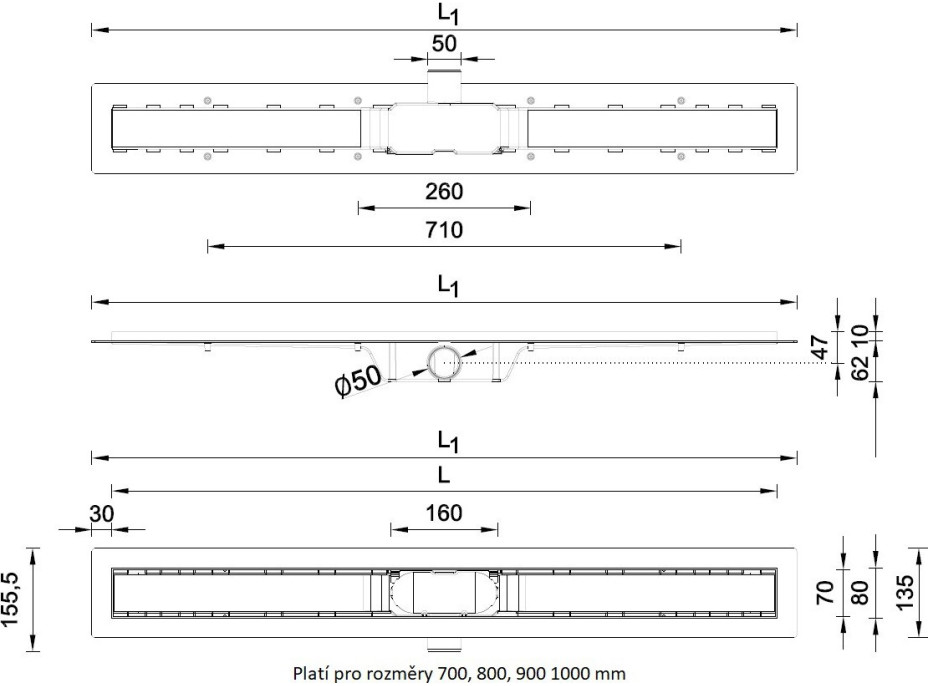 Odtokový žlab M - 700: délka roštu 70 cm, délka žlabu 76 cm