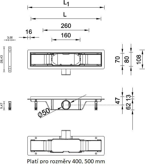 Odtokový žlab M - 500: délka roštu 50 cm, délka žlabu 53 cm
