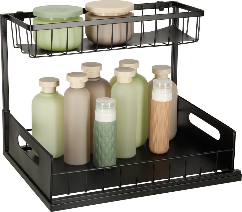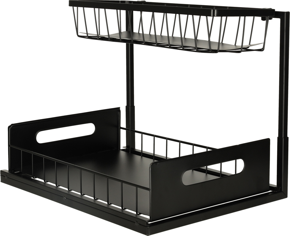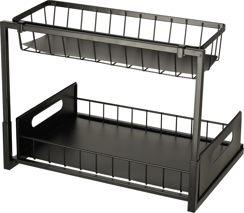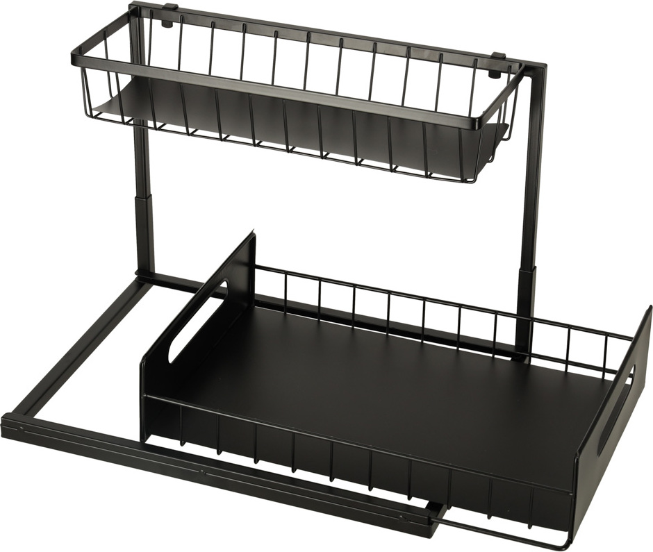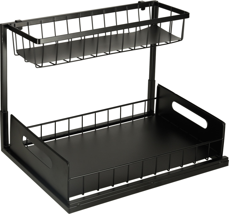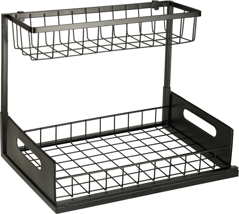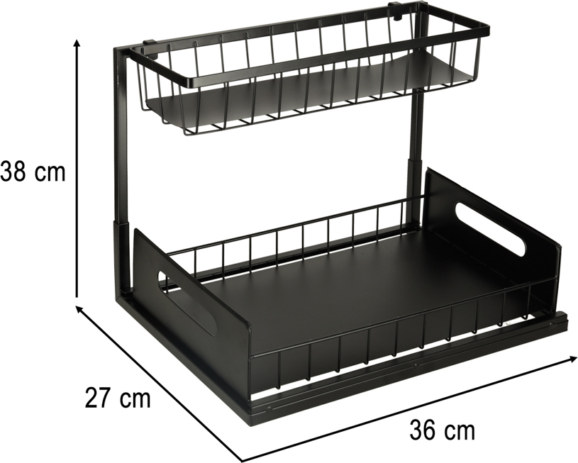 Tento dvoupatrový kovový organizér pod dřez je praktický produkt, který pomáhá udržovat pořádek. Spodní košík se vysouvá, což usnadňuje přístup k předmětům uloženým za ním. Horní, menší police je ideální pro drobnosti, jako jsou nákupní tašky. Organizér je dodáván v klasické černé barvě.
