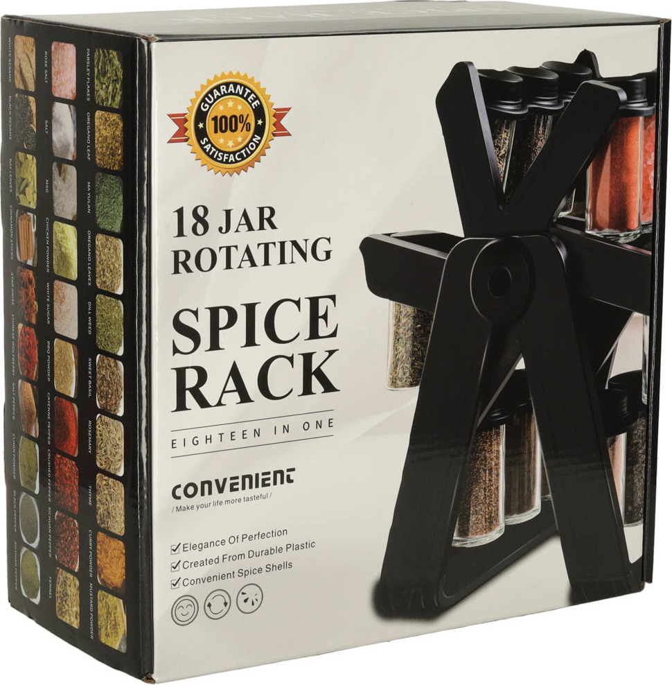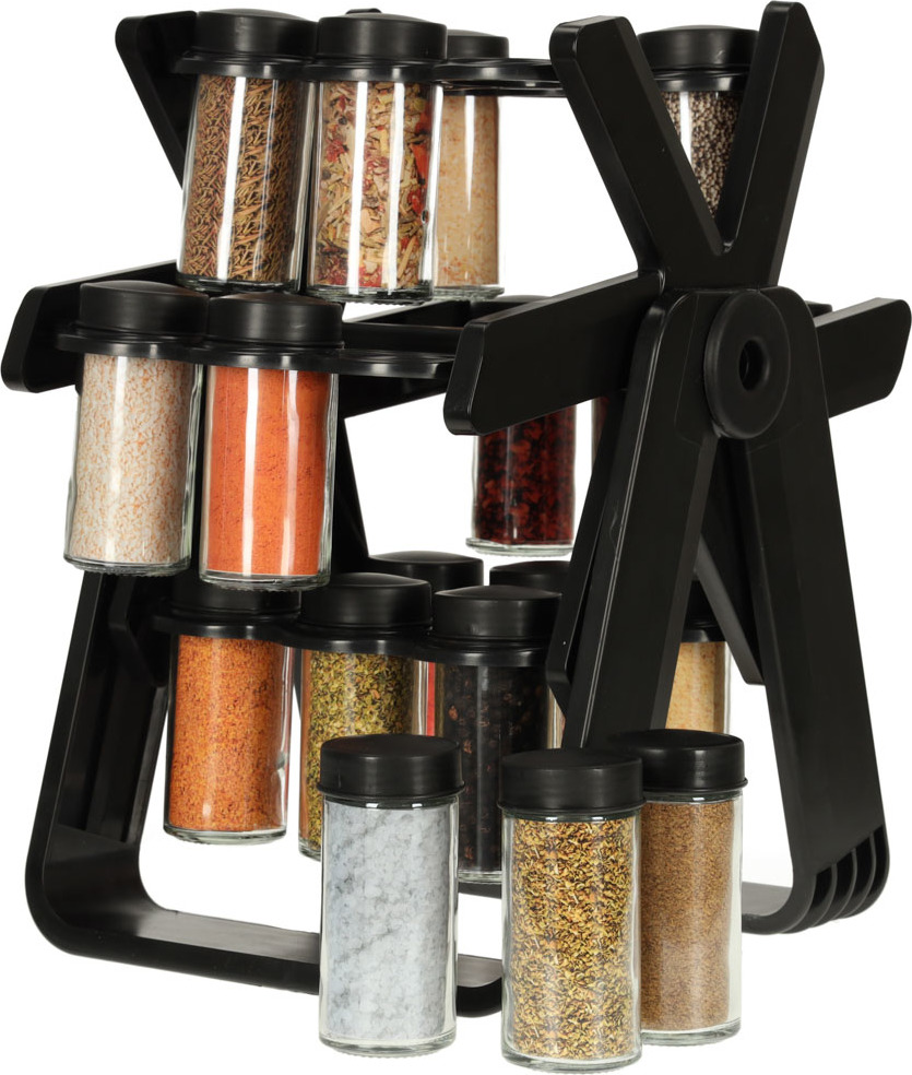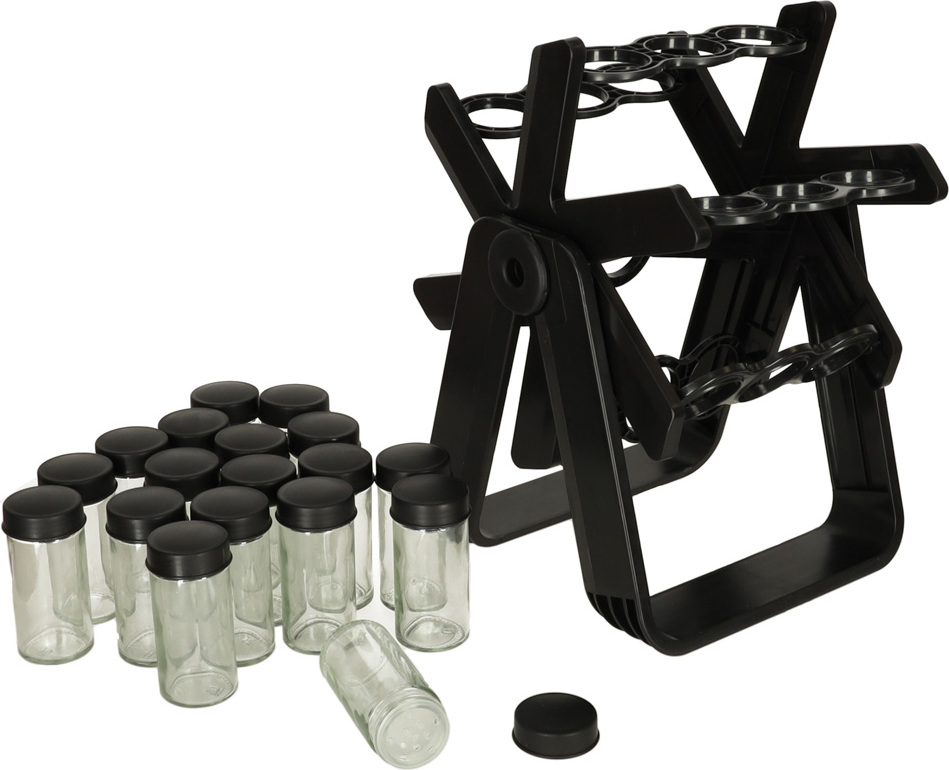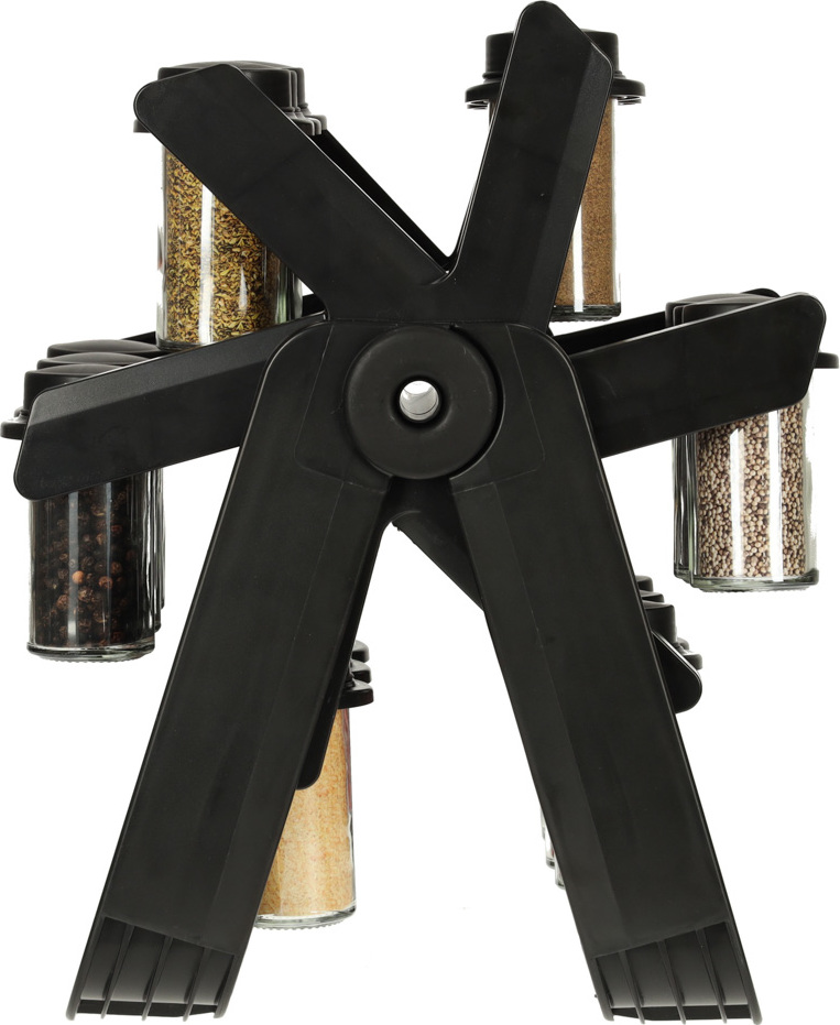 Otočný organizér na koření. Snadno si uspořádejte nejčastěji používané koření. Sada obsahuje 18 šroubovacích nádobek. Organizér je v matně černé barvě, takže se stane elegantním doplňkem vaší kuchyňské linky. Otočný design umožňuje snadný přístup ke koření.