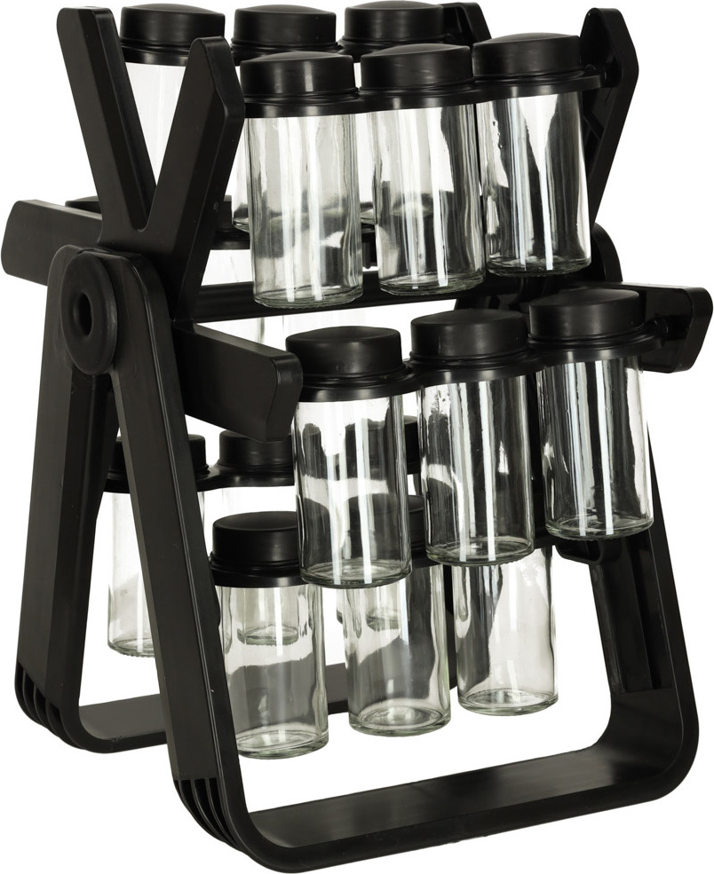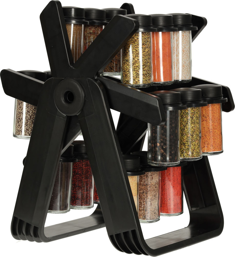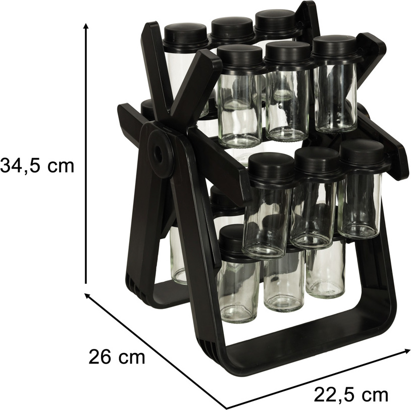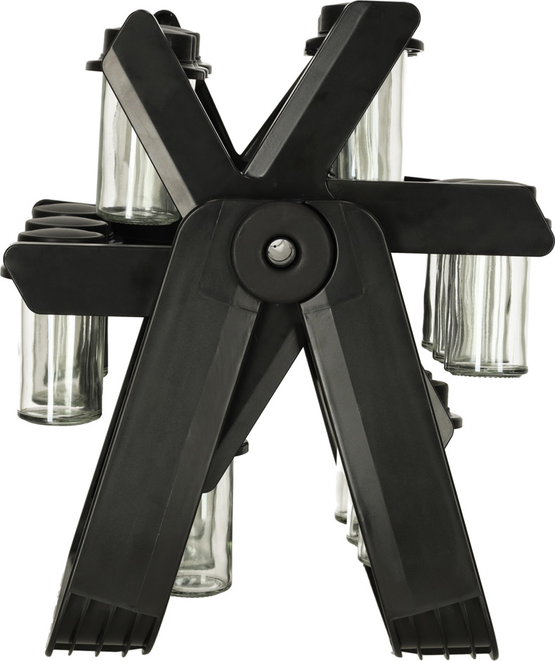 Otočný organizér na koření. Snadno si uspořádejte nejčastěji používané koření. Sada obsahuje 18 šroubovacích nádobek. Organizér je v matně černé barvě, takže se stane elegantním doplňkem vaší kuchyňské linky. Otočný design umožňuje snadný přístup ke koření.