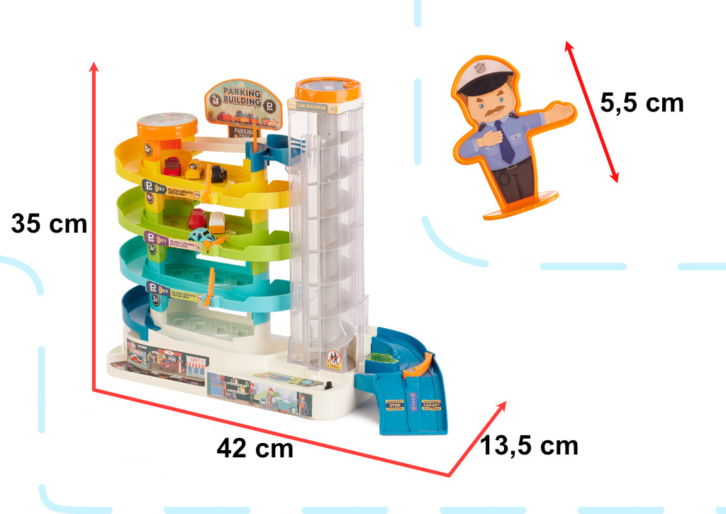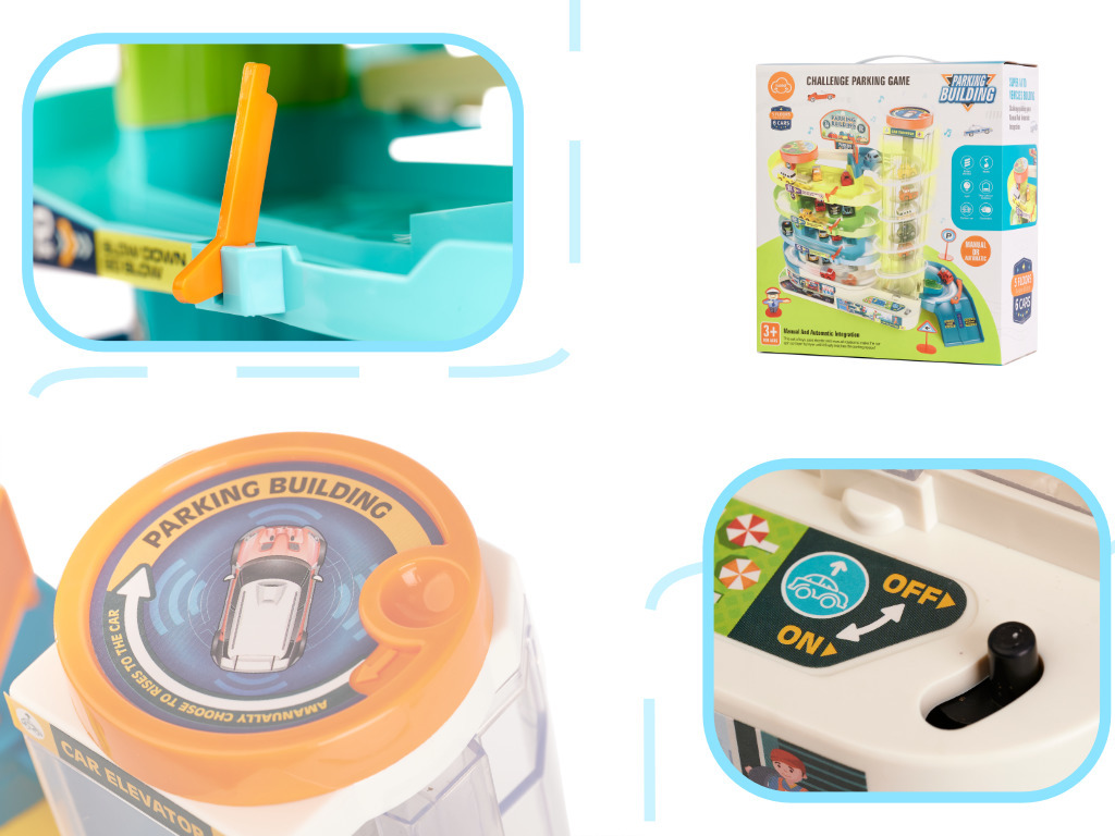Parkoviště má až 4 úrovně, které jsou určeny pro parkování automobilů, které najdete v sadě. Auta se nahoru dostanou pomocí automatického výtahu. Pro zpříjemnění času stráveného ve výtahu je výtah vybaven světelnými a zvukovými efekty. Během jízdy nahoru bude hrát veselá melodie.