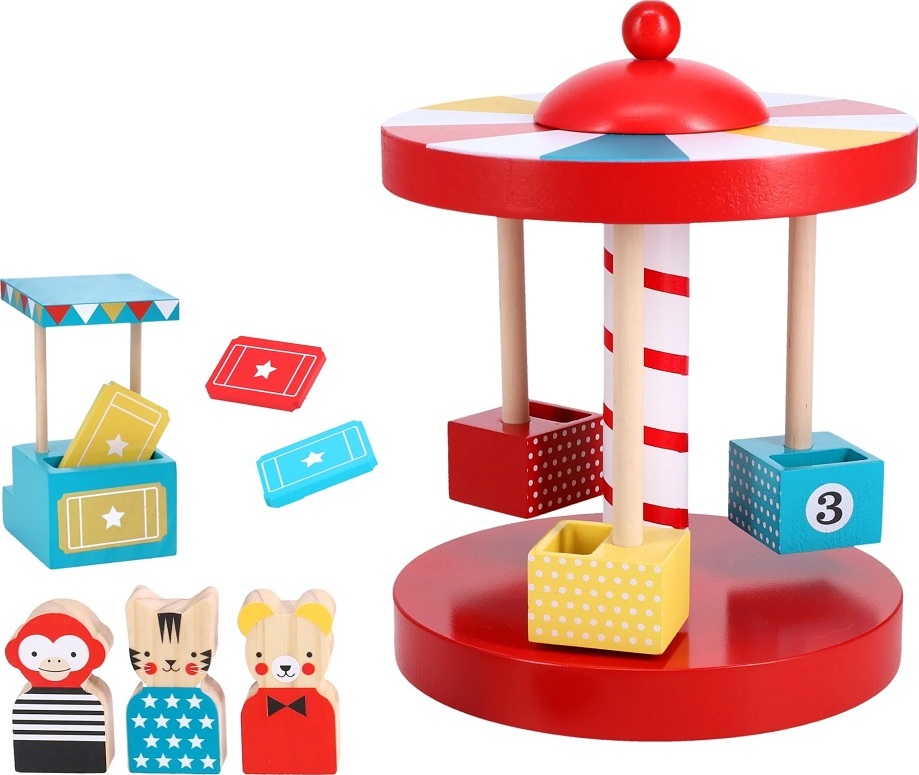 Dostaňte se na pouť! Jste připraveni vzít opici, koťátko a medvěda na kouzelnou jízdu? Jednoduše vhoďte lístky do stánku, posaďte své zvířecí kamarády na sedadla a otáčejte střechou, aby se kolotoč roztočil! Tato krásná dřevěná hračka rozvíjí dovednosti v řešení problémů, prohlubuje pochopení příčiny a následku a podporuje nápadité vyprávění a samostatnou hru. Vhodná je pro děti od 2 let. Dva díly kolotoče se dají zasunout do sebe, takže nevyžadují žádné nástroje, a kolotoč je připraven rovnou ke hraní. Tři dřevěné zvířecí postavičky lze použít k obsluze pokladny, k jízdě na kolotoči nebo v samostatných scénách, které si dítě samo vytvoří. Navíc tři vstupenky a očíslovaná sedadla lze využít k rozvoji počítání a numerických dovedností.