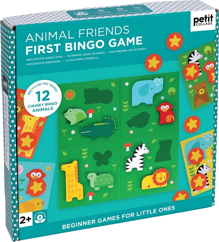 Buďte první! Roztomilá verzi klasické hry. Děti si užijí spoustu zábavy při vytahování velkých dřevěných zvířátek z pytle, křičení jejich jmen a jejich přiřazování k příslušným místům na hrací desce. Mezitím ostatní hráči hledají zvířátka na svých bingo kartách a zakrývají všechna shodná zvířátka žetony. První hráč, který zakryje všech pět tvorů na své kartě a zakřičí „Bingo!“, vyhrává. Tato hra pro začátečníky, ideální pro 2–4 hráče ve věku 2+, je navržena tak, aby děti seznámila s principy střídání hráčů a s tím, jak vyhrávat a prohrávat s grácií. Zároveň podpoří jejich pozorovací schopnosti, rozvoj řeči a jazyka, trpělivost a schopnost soustředění. Figurky zvířat jsou vyrobeny z recyklovaného dřeva FSC a taška je vyrobena z recyklovaného plastu. Obal je potištěn ze 75 % recyklovaných materiálů a rostlinnými inkousty.