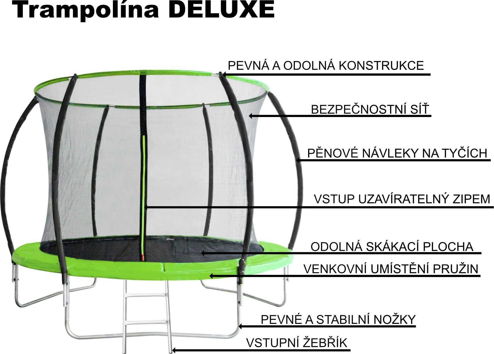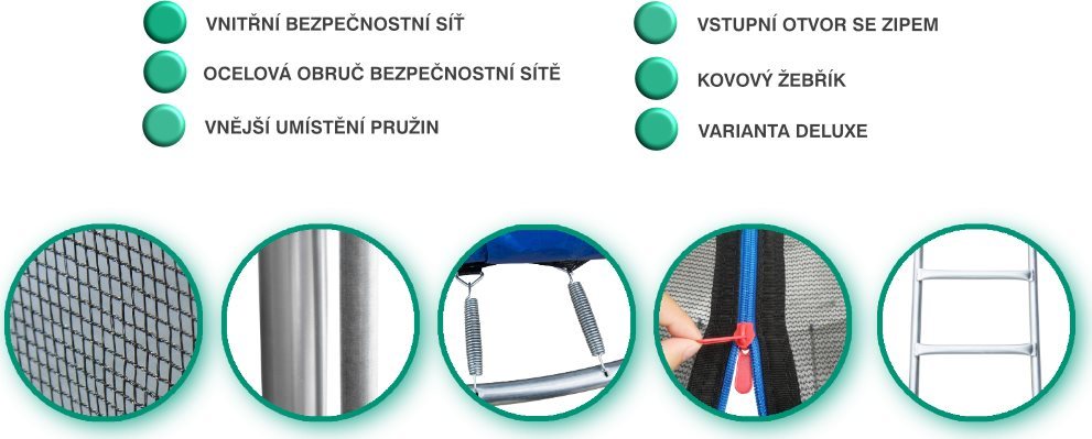 Nejen děti, ale i dospělí milují skákání na trampolíně a proto je trampolína skvělým doplňkem každé zahrady. Skákáním na trampolíně lze dosáhnout dlouhodobého přínosu pro zdraví, psychickou pohodu, lepší pohyblivost, kontrolu hmotnosti, menší pravděpodobnost vzniku nadváhy, zlepšení srdečně cévní činnosti a činnosti dýchacího aparátu. stabilní nohy ve tvaru písmene U odrazová plocha z kvalitního materiálu vnitřní bezpečnostní síť (brání doskoku do části s pružinami)