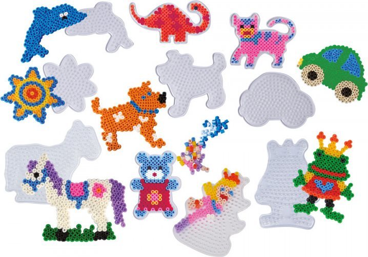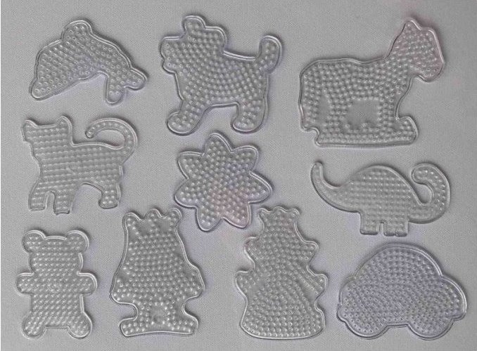 Plastové podložky jsou určeny pro skládání a tvoření obrázků ze zažehlovacích korálků. Podložky jsou průhledné, aby pod ně bylo možné umístit předlohu (není součástí balení). Balení obsahuje: 10 ks podložek ve tvaru postav, zvířátek a věcí.