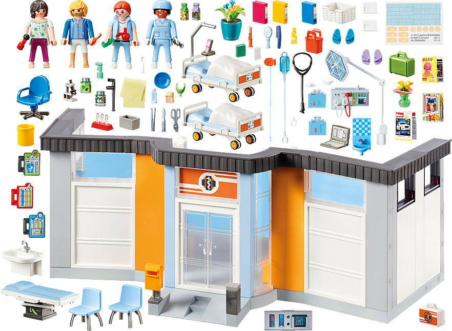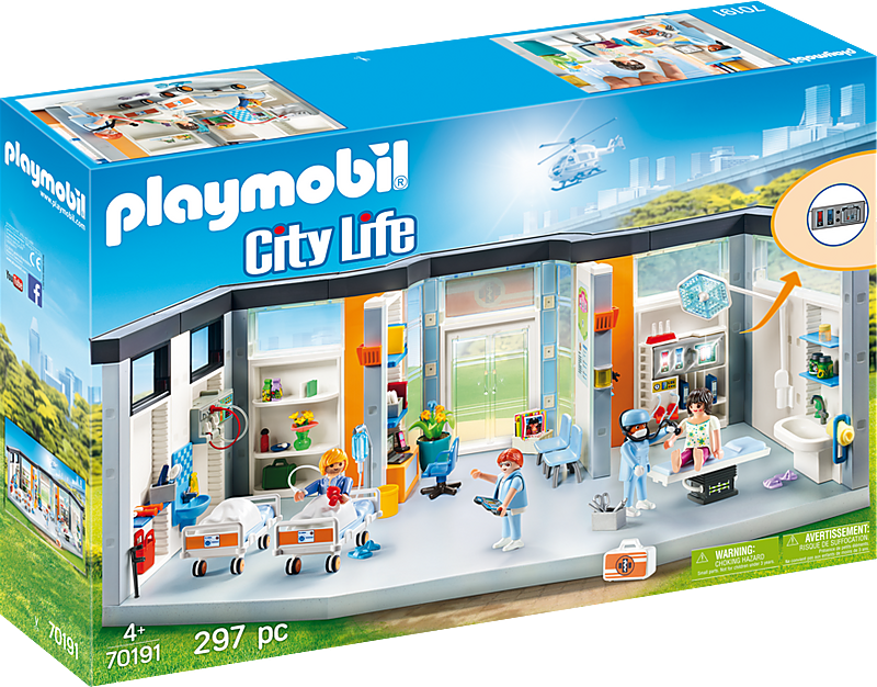 V nemocnici jsou lékaři a sestřičky v jednom kole. Sanitka dovezla zraněného pacienta o kterého je třeba se postarat. nemocnice je vybavena světelnými efekty (provoz na 1,5 V baterii, není součástí balení) součástí nemocnice jsou lůžka pro pacienty, operační sál i vyšetřovna balení obsahuje čtyři figurky Vhodné pro děti od 4 let. Téma: PLAYMOBIL® NemocniceVlastnosti