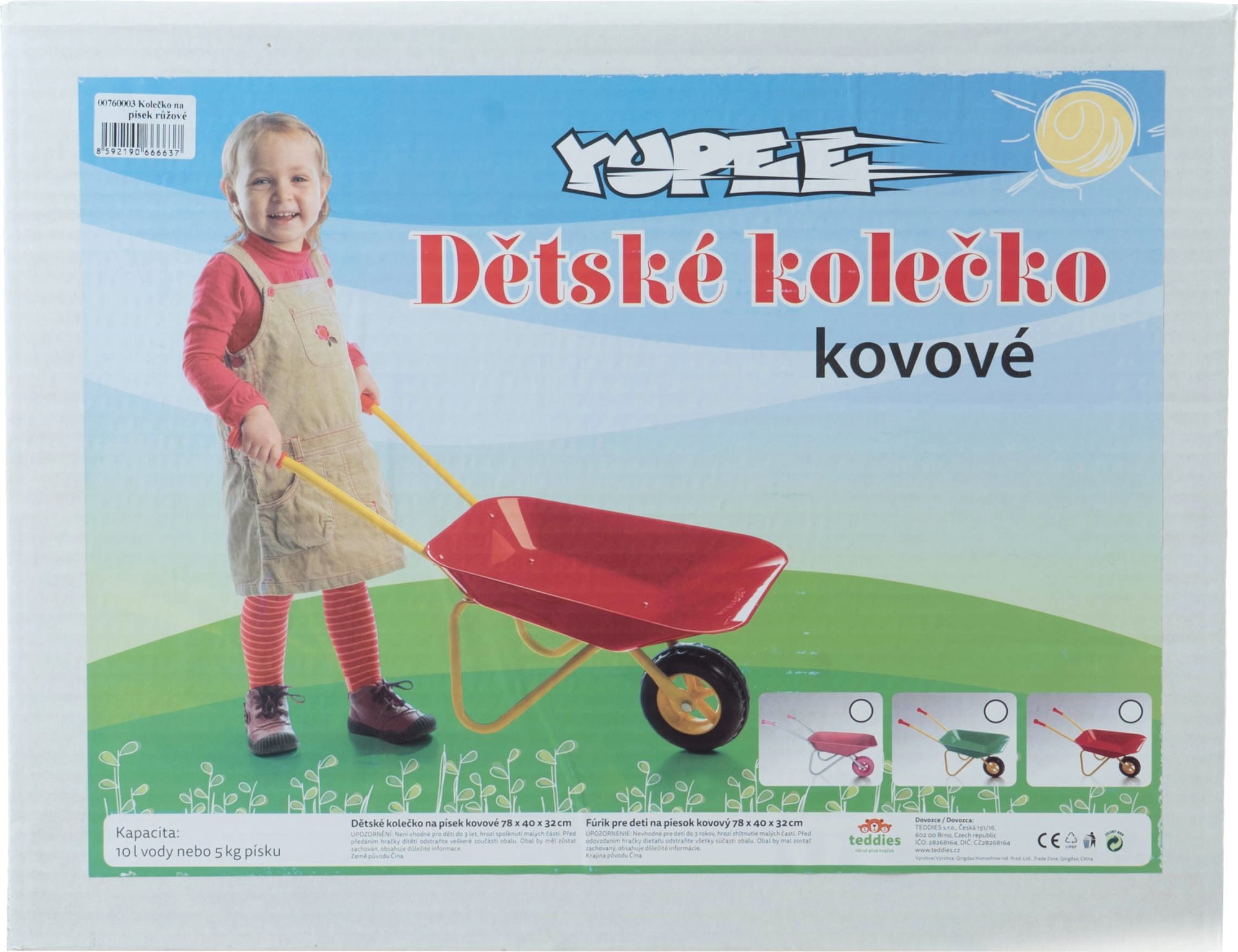 Dětské plechové kolečko by nemělo chybět žádnému zahradníkovi. Hračka je vhodná na pískoviště i do zahrady. Kolečko je vyrobeno z pevného plechového materiálu. Držadla jsou opatřena plastovými úchyty. Korba má zaoblené rohy. Rozměry kolečka: 78 x 40 x 32 cm Objem: 10 l vody nebo 5 kg písku