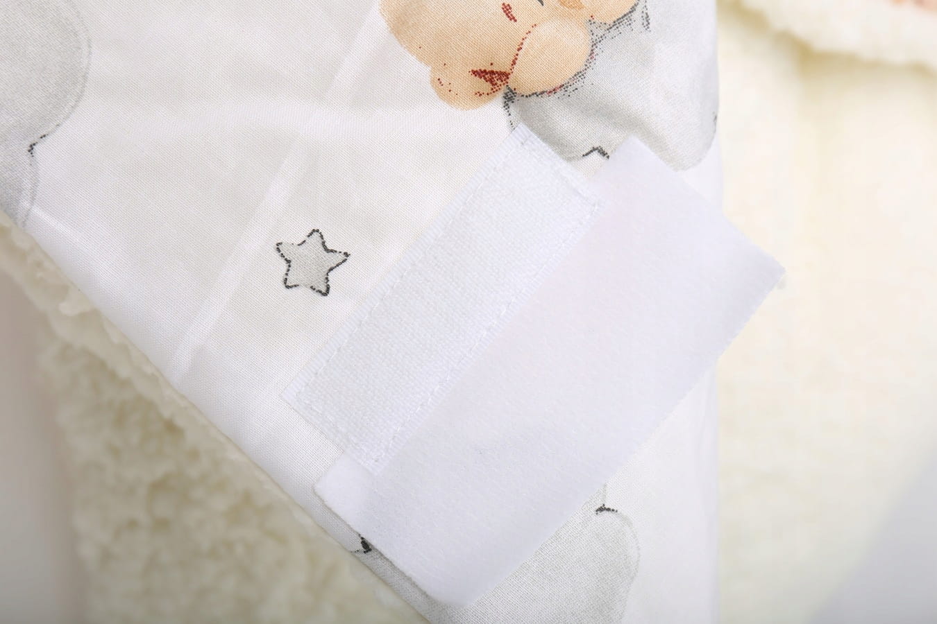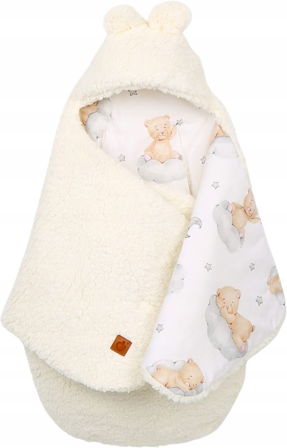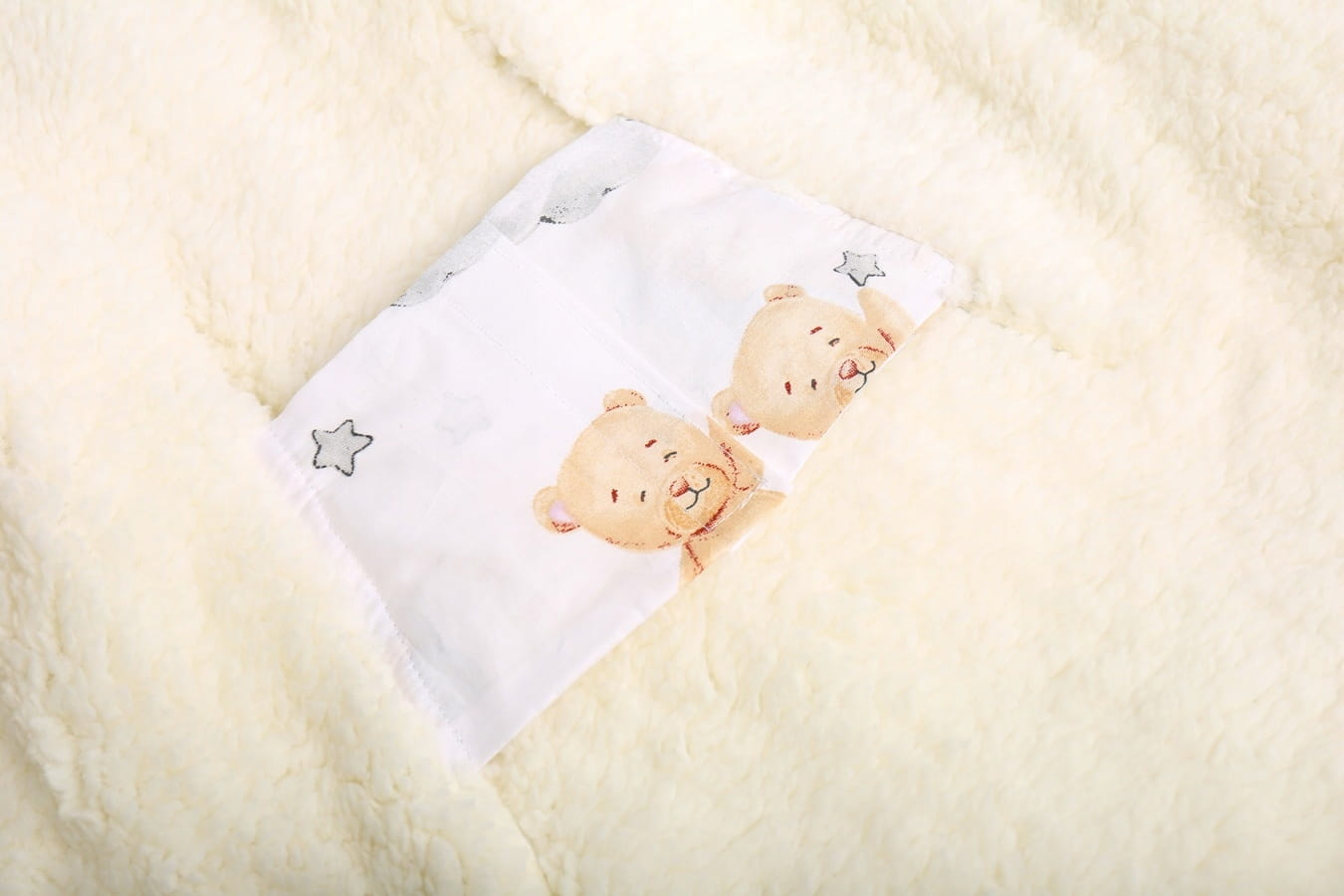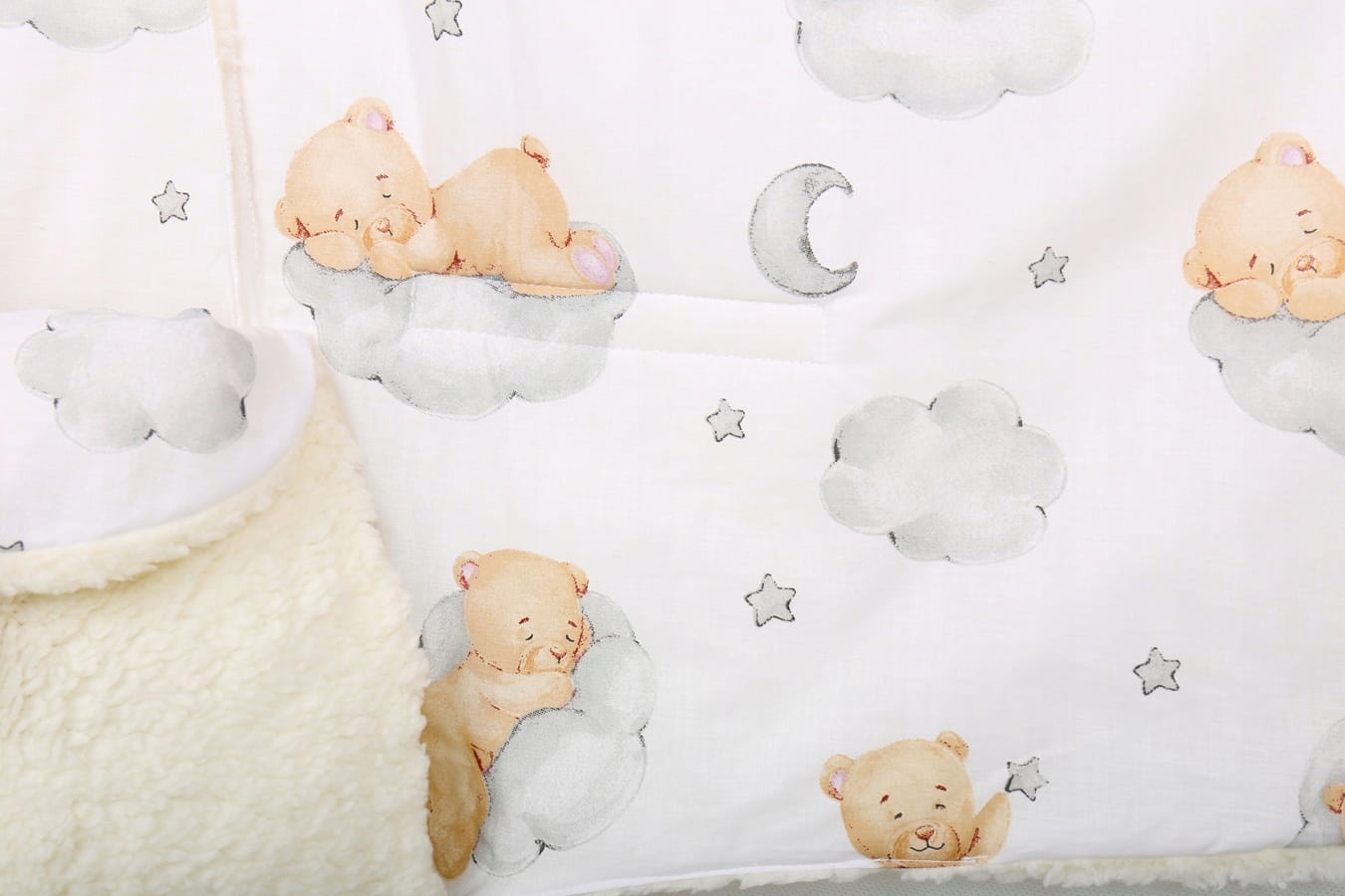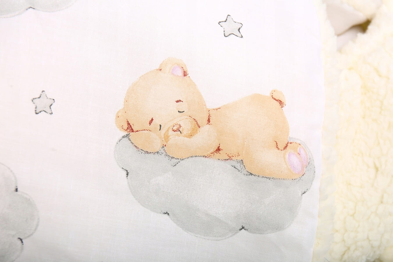 Plyšová zavinovačka s kapucí BABYMAM do autosedačky - Medvídek v oblacích/beránek ecru