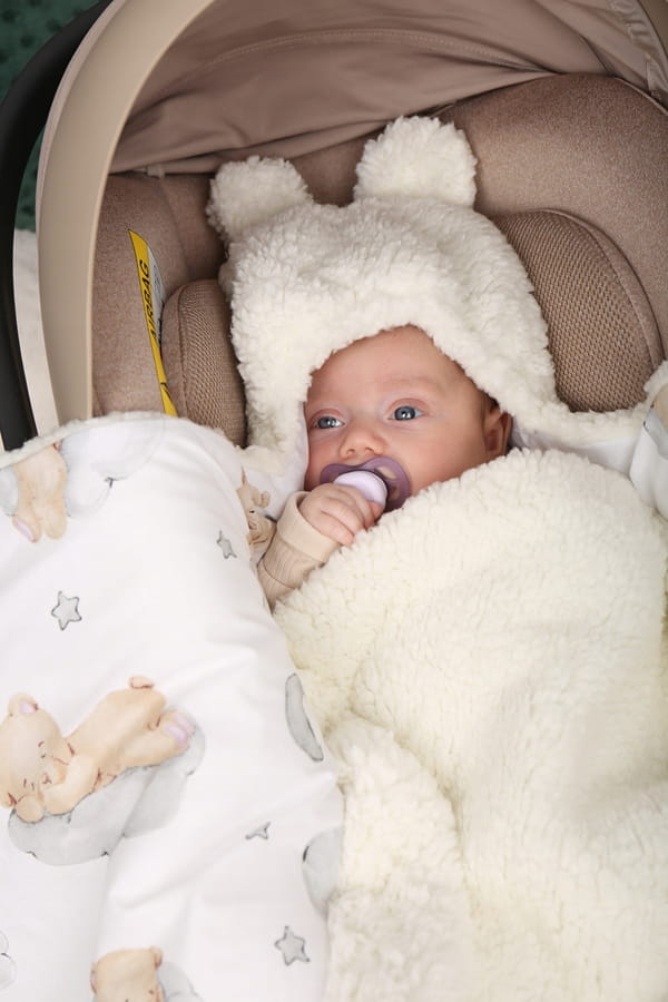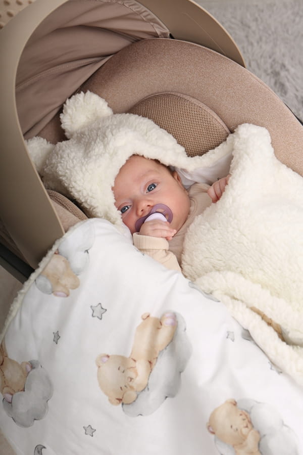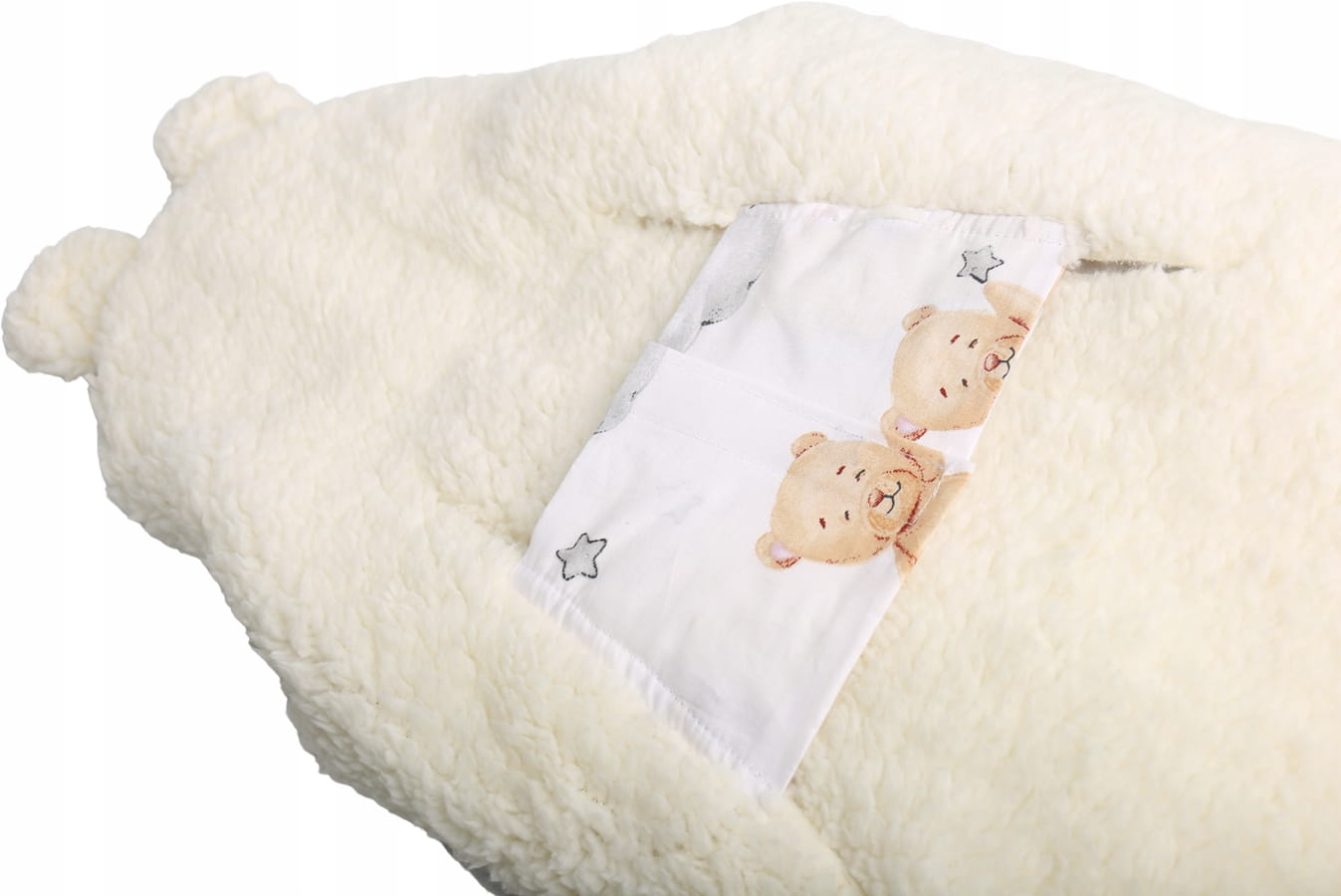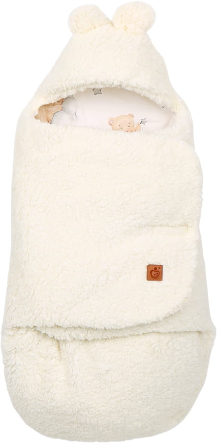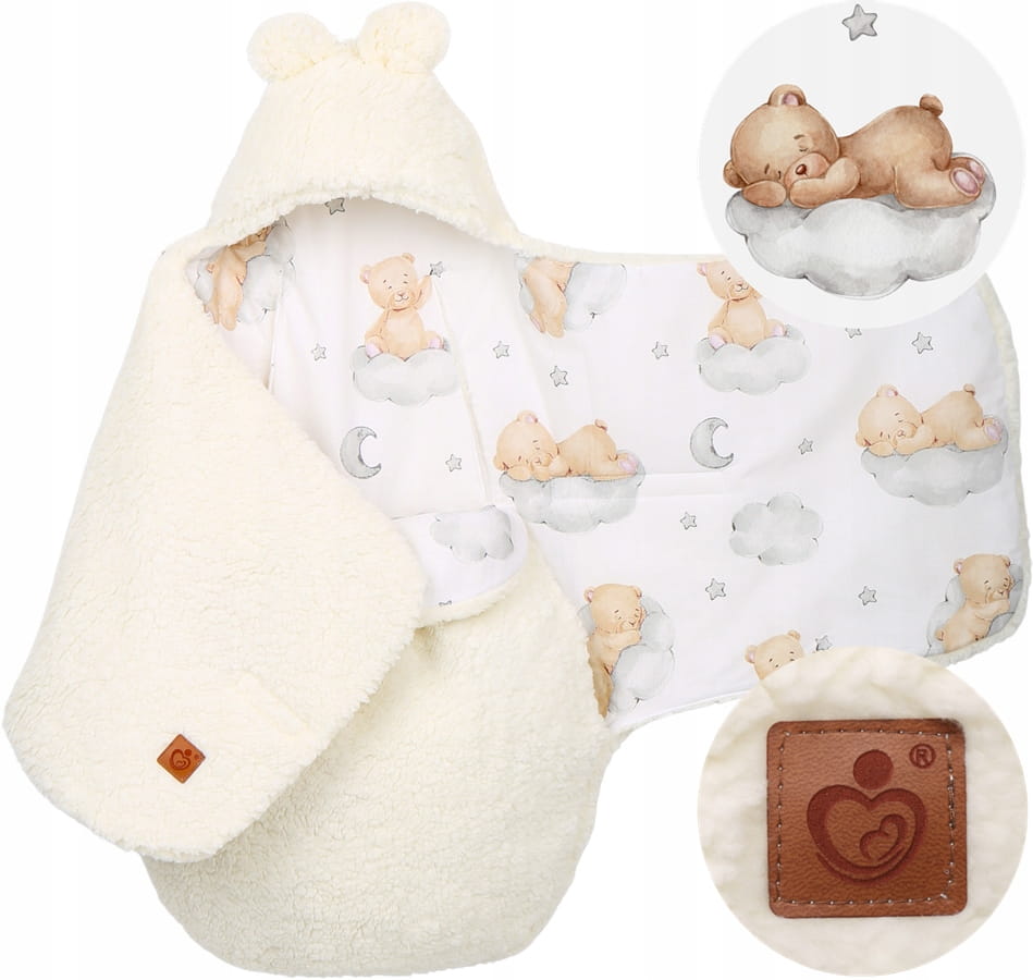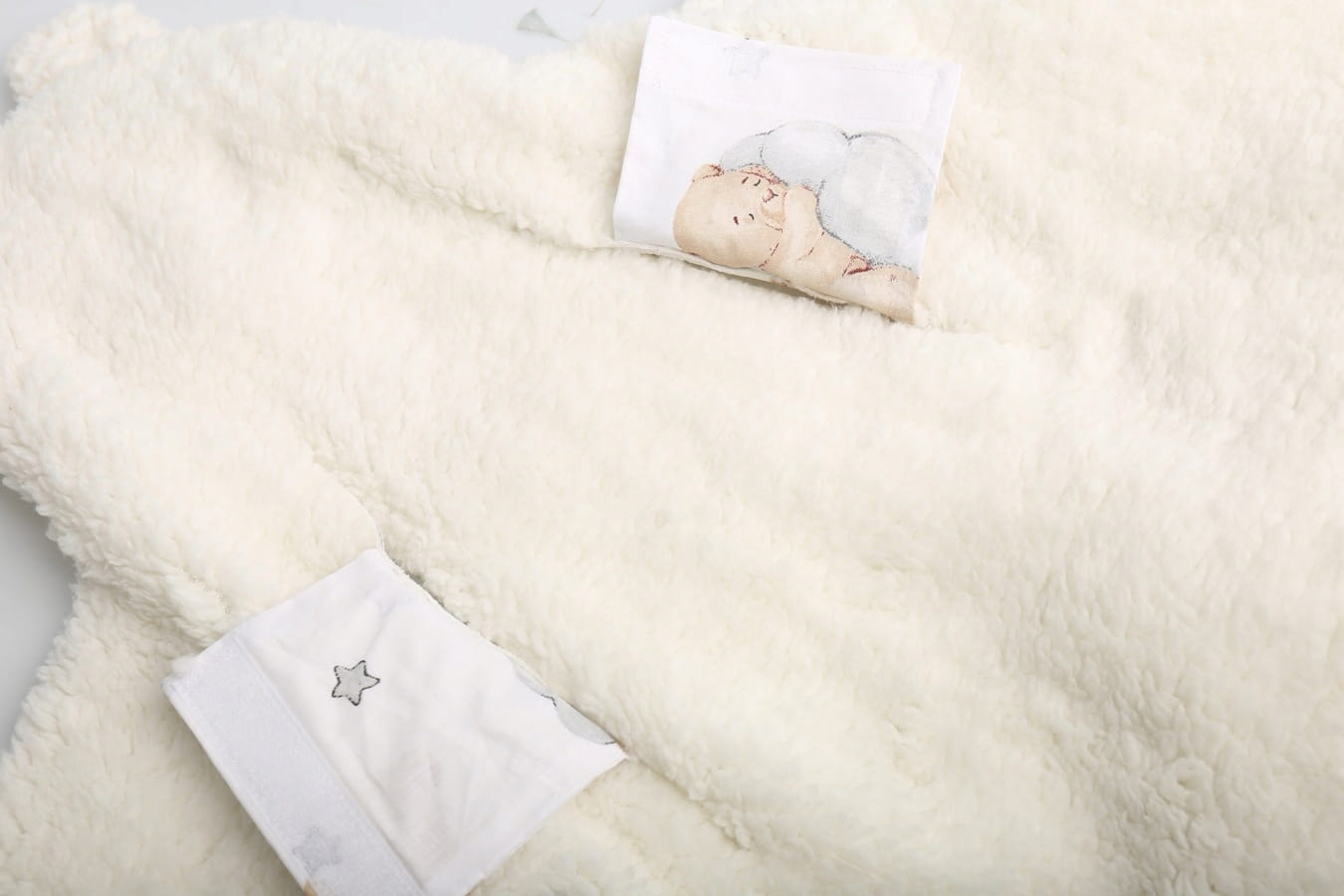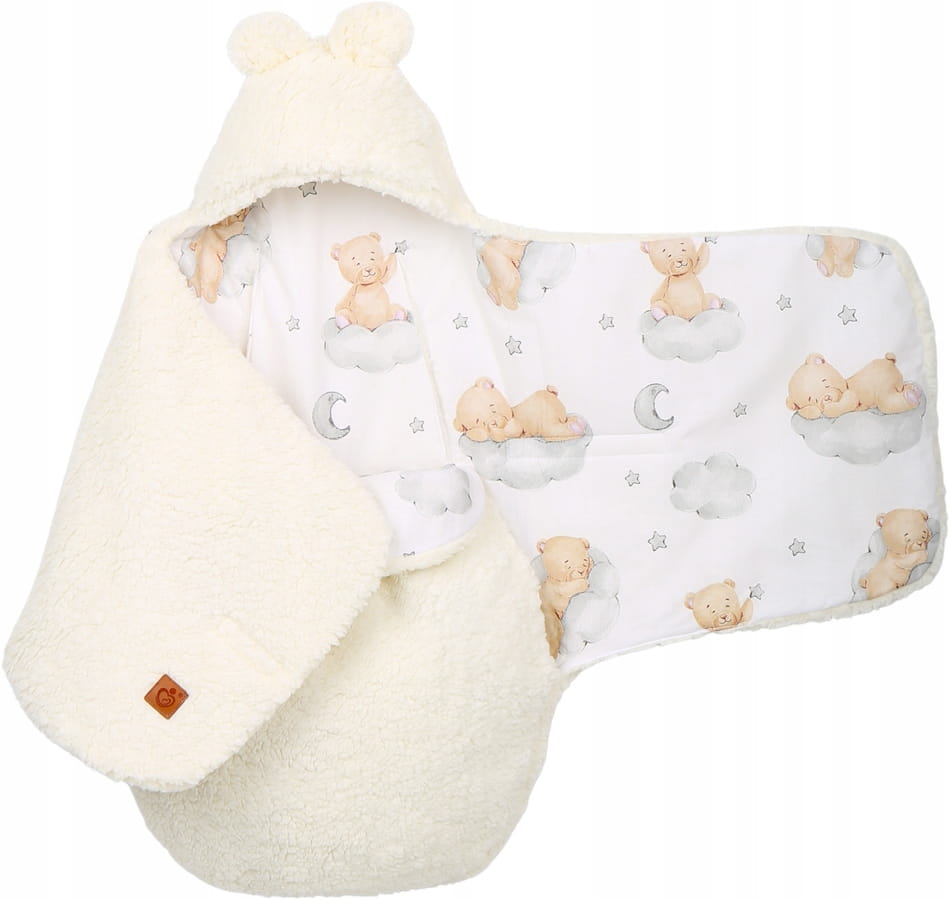 Plyšová zavinovačka s kapucí BABYMAM do autosedačky - Medvídek v oblacích/beránek ecru
