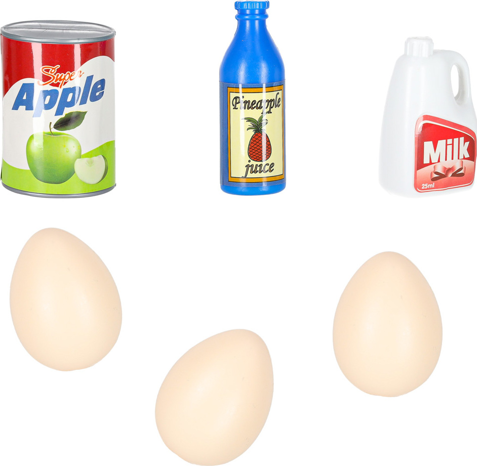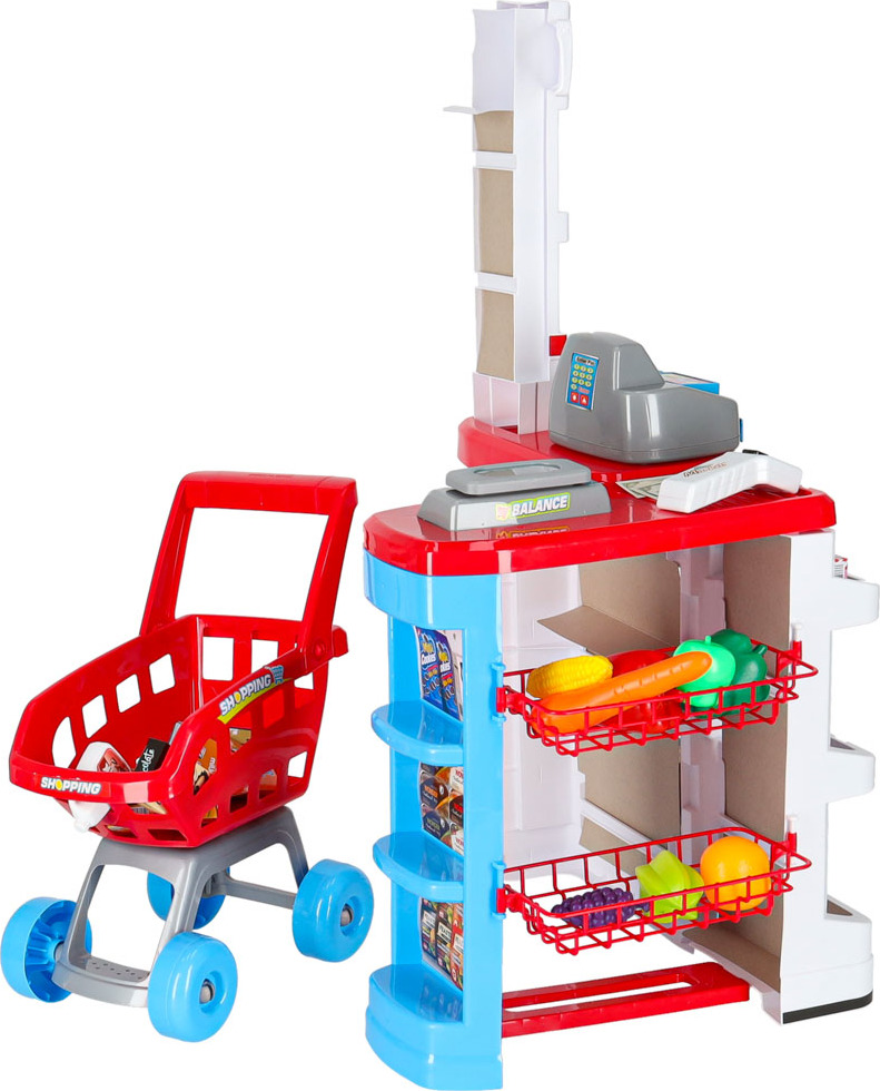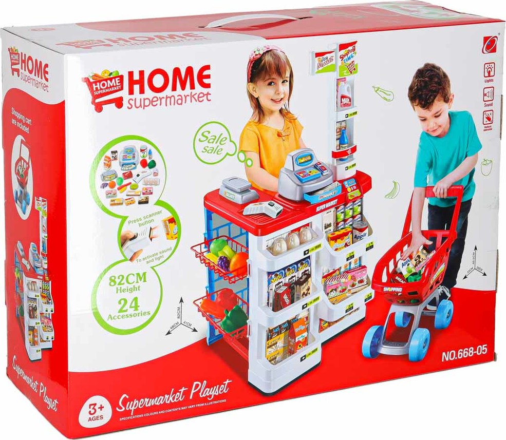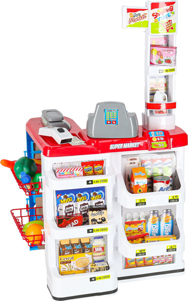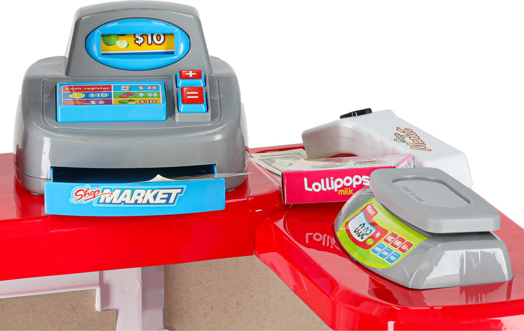 V sadě najdete všechny potřebné prvky k vytvoření skutečného obchodu s potravinami. Mezi mnoha prvky najdete plastové ovoce, zeleninu, vejce a kartonové krabice imitující obaly od sušenek, džusů a bonbonů. Stejně jako v profesionálním obchodě je hračka vybavena pokladnou s otevírací zásuvkou, čtečkou čárových kódů a váhou. Stisknutím tlačítka můžete změnit částku na pokladně. Nepopiratelný vrchol sady je snímač čárových kódů, který vydává zvuky podobné těm skutečným.