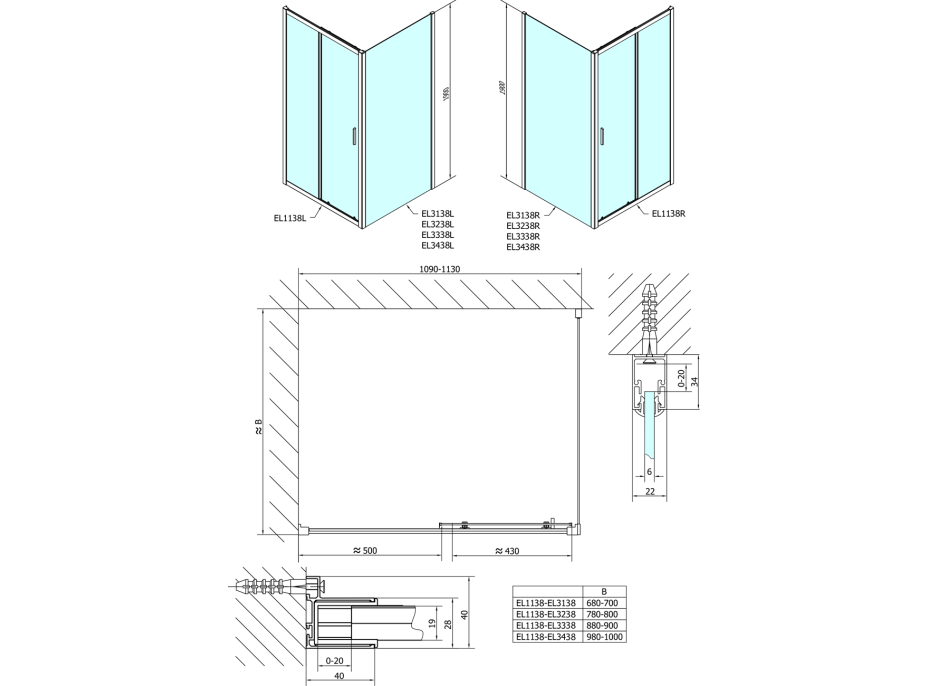 - Instalační rozměr dveří do niky lze díky rozšiřovacímu profilu EL825 zvětšit o 25 mm na každou stranu, celkem o 50 mm