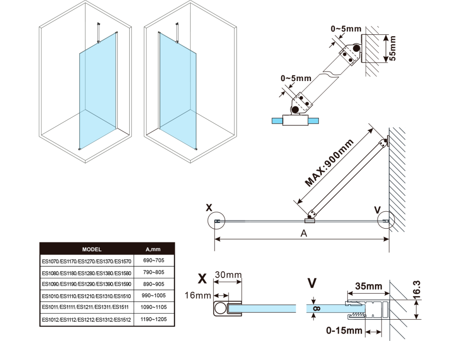 - Stěnové profily s tolerancí 15 mm usnadňují stabilní montáž zástěn, instalace je možná na dlažbu nebo sprchovou vaničku